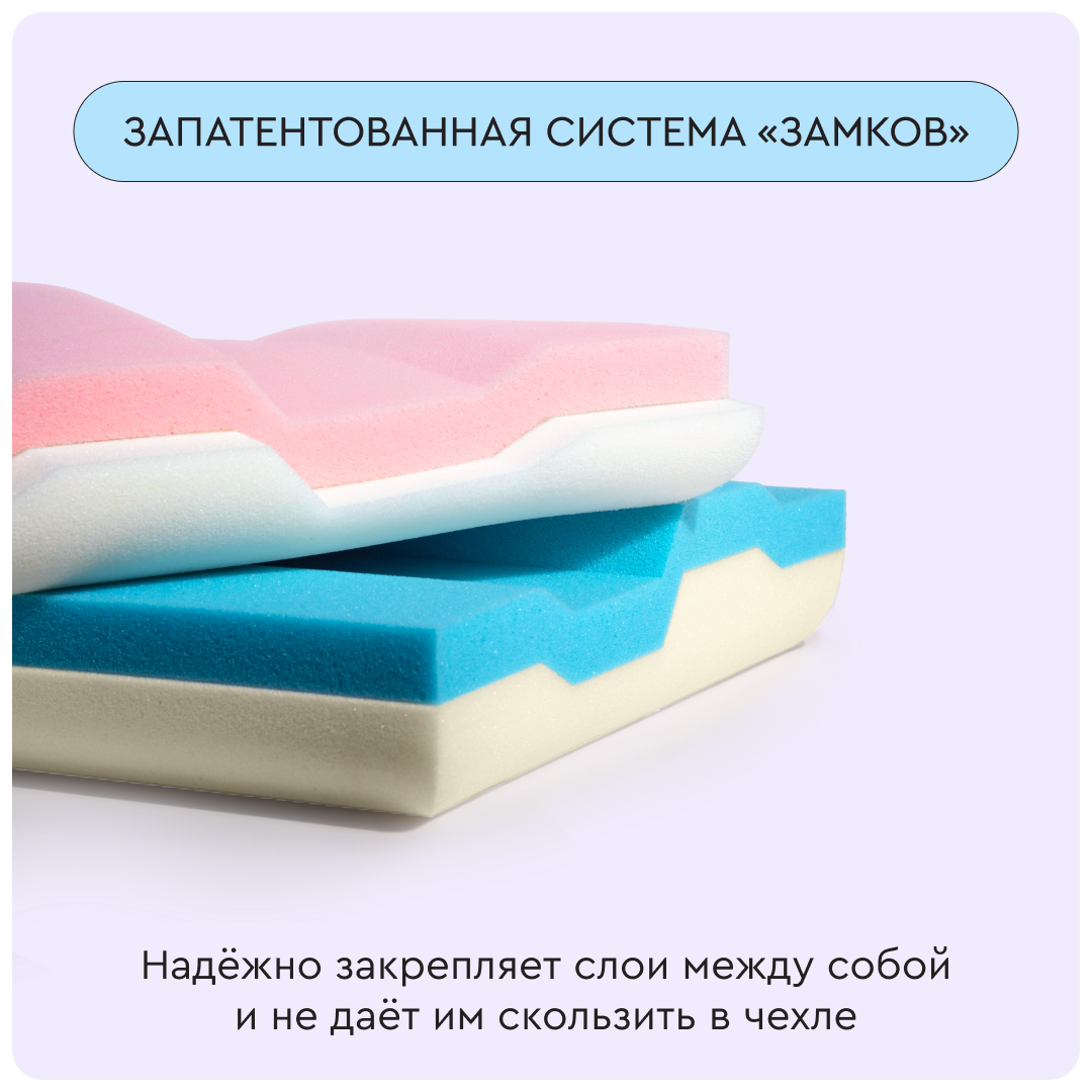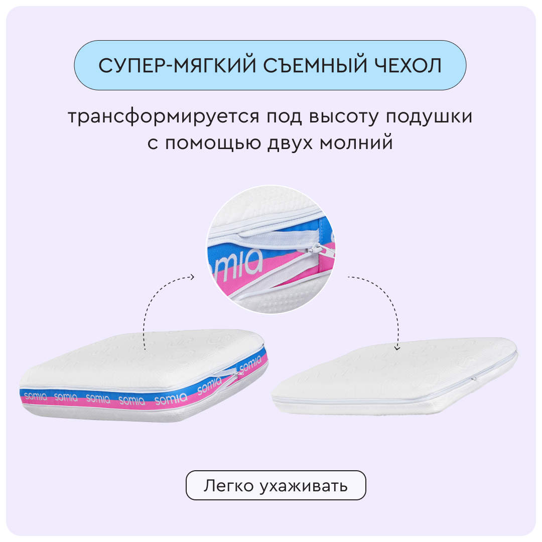 Уникальная технология нарезки пены обеспечивает надежную фиксацию слоев из высококачественной сертифицированной пены. Съемный чехол на молнии способен подстроиться под нужный уровень, который вы выбрали для подушки.