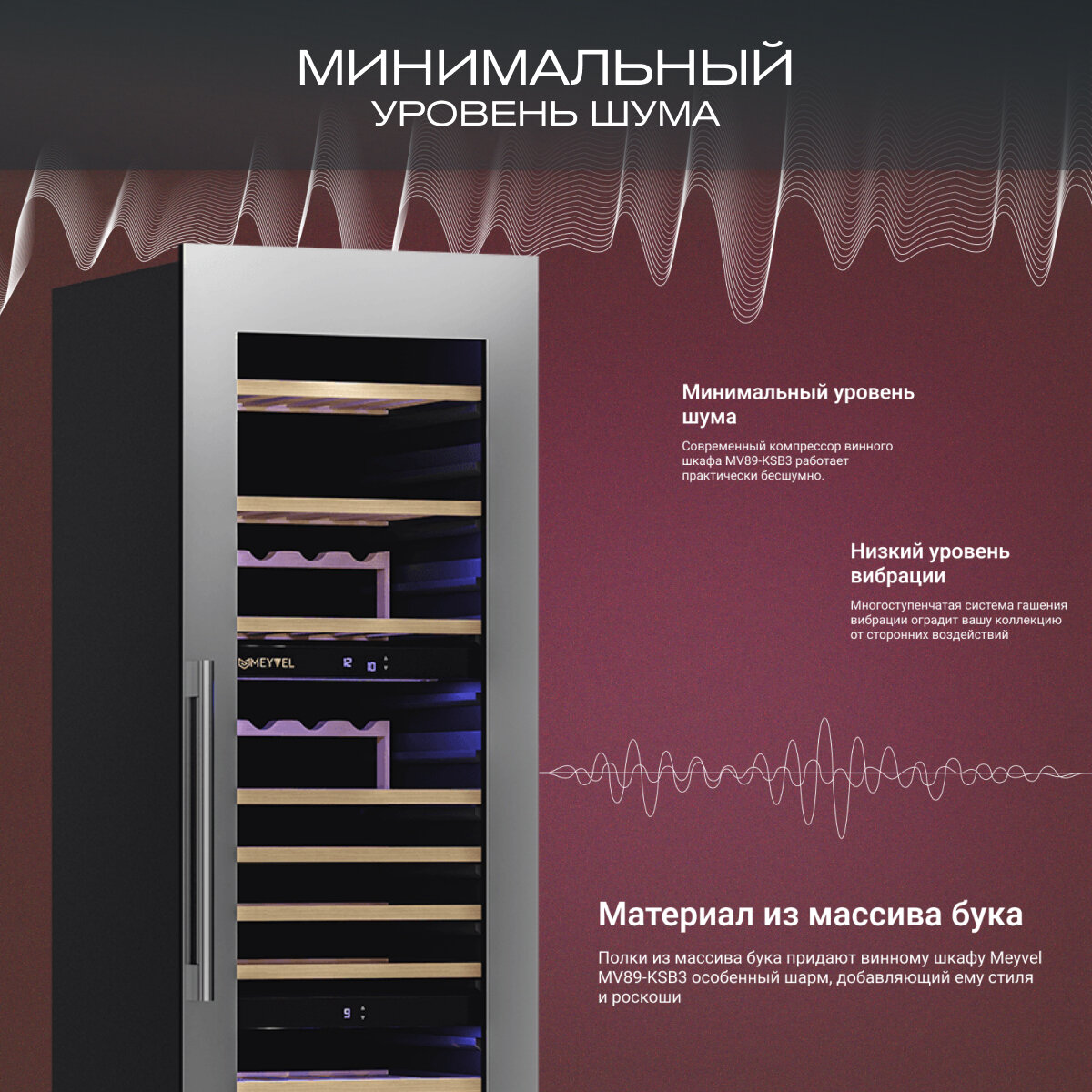 Компрессорный винный шкаф MEYVEL (Мейвел) – это гармоничное сочетание красивого внешнего вида, прекрасных технических характеристик и отличного функционала. Модель создана с применением современных технологий и из натуральных, качественных материалов. Благодаря динамической системе охлаждения внутри камеры сохраняется оптимальная для вина температура и влажность.