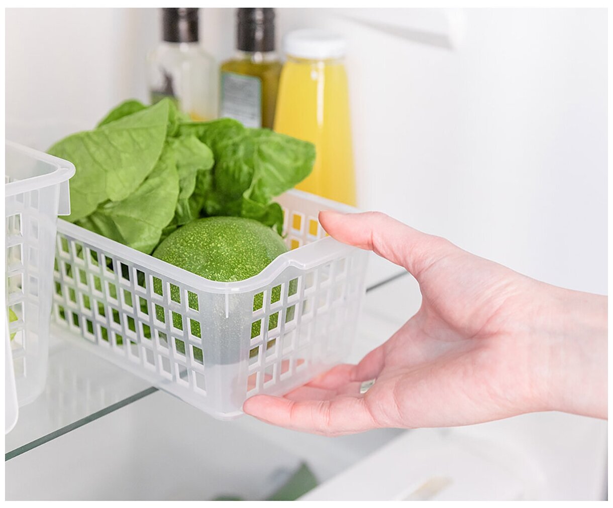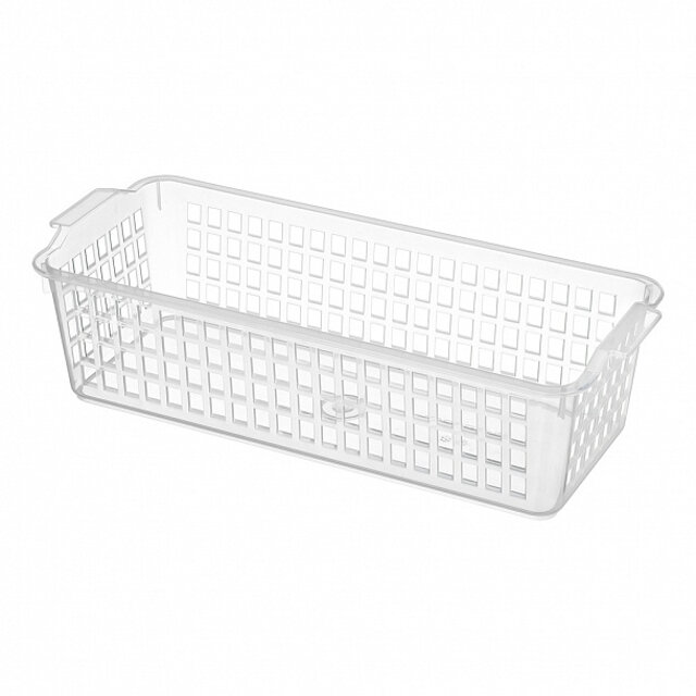 Универсальная корзинка подходит для организации хранения на кухне и в холодильнике. Простое решение для хранения продуктов на полках холодильника. Благодаря перфорации на стенках корзинки создается дополнительная вентиляция содержимого. Несколько корзинок легко вкладываются друг в друга в пустом виде для экономии места на кухне. Корзинка удобна для хранения продуктов на полках кухонных шкафов. Благодаря боковым ручкам корзинку удобно переносить или снимать с полки. Прозрачные стенки позволяют видеть, что именно хранится внутри.