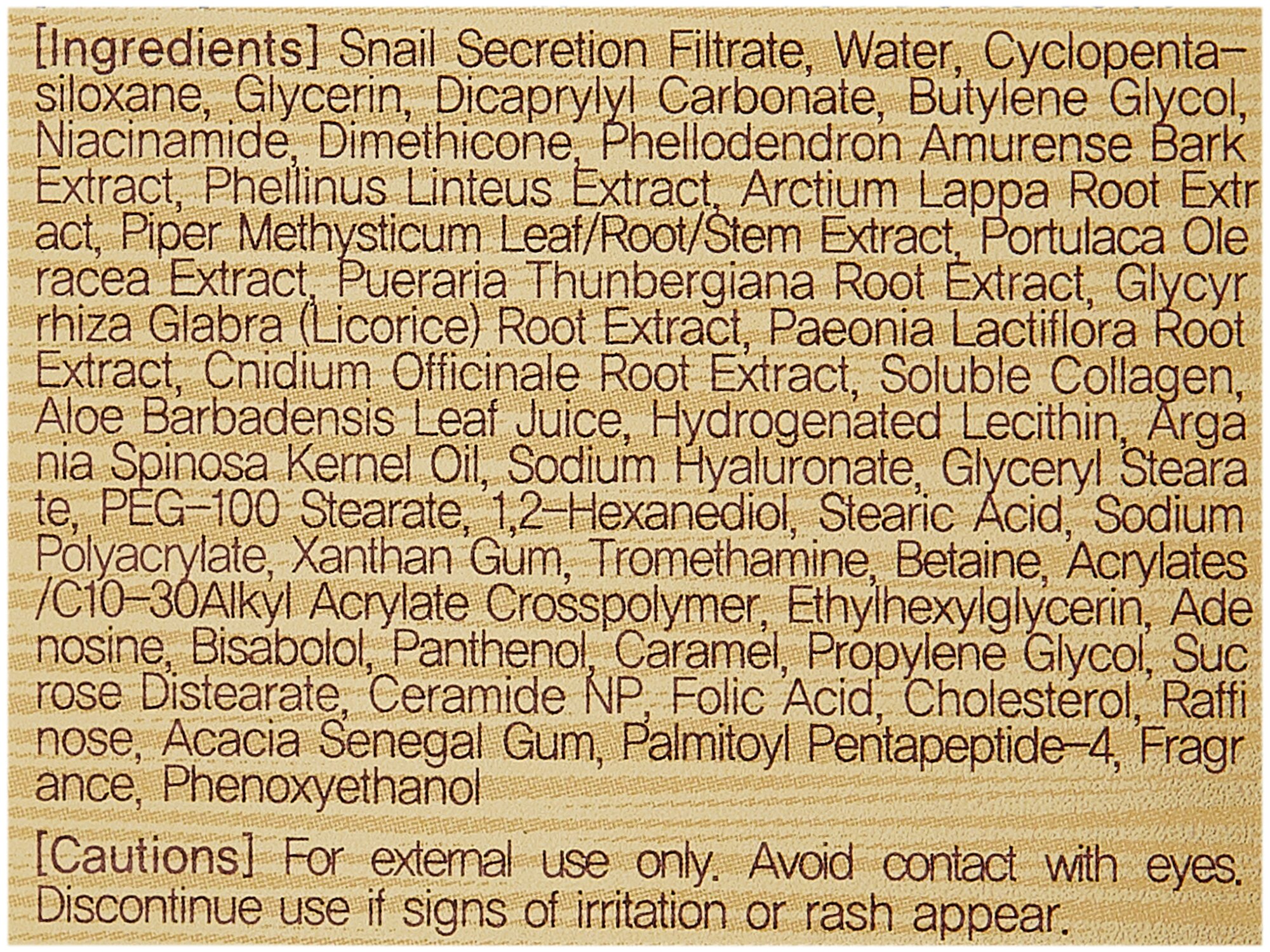 | Состав | фильтрат секреции улитки, вода, циклопентасилоксан, глицерин, dicaprylyl карбонат, бутилен гликоль, ниацинамид, диметикон, пайпер methysticum лист/корень/стебель экстракт, растворимый коллаген, сок листьев алоэ барбаденсис, 1,2-hexanediol, гидрированный лецитин, экстракт, расшивой phellodendron amurense |