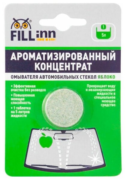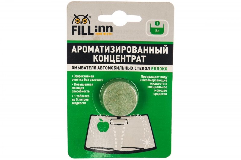 Ароматизированный концентрат стеклоомывателя в таблетке FILL INN превращает воду и незамерзающие жидкости в моющий состав, который эффективно справляется с загрязнениями стекол и фар. Не оставляет пятен, разводов, масляно-жировой пленки после применения, обеспечивая водителю наилучший обзор и безопасность движения. Обезжиривает поверхность стекла и рабочую часть щеток стеклоочистителя. Безопасен для лакокрасочного покрытия, металлических и резиновых частей автомобиля. Имеет приятный аромат зеленого яблока. В зимний период добавляется в незамерзающую жидкость для повышения ее моющей способности. Количество в упаковке - 1 шт массой 8,5 граммов.