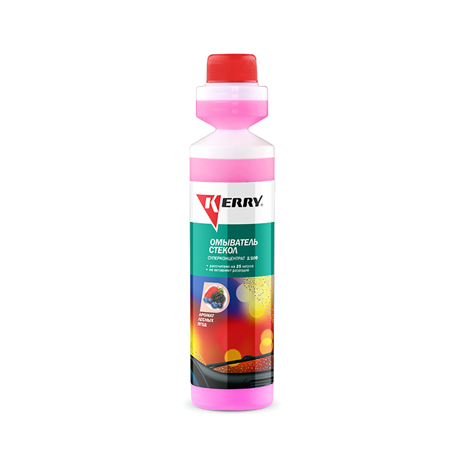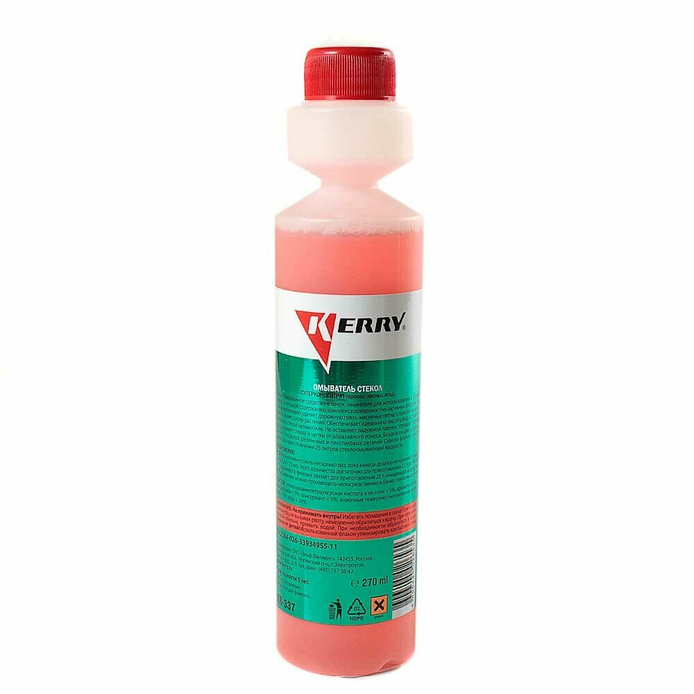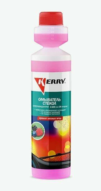 Жидкость стеклоомывателя KERRY KR-337 концентрат, лесные ягоды, 0,27 л Концентрированное средство KERRY для автомобильного бачка омывателя содержит комплекс поверхностно-активных добавок, благодаря которому быстро и эффективно удаляет дорожную грязь, следы насекомых, смолу растений, птичий помёт и масляные пятна. Средство также улучшает работу щёток. Концентрат не токсичен и полностью безопасен для лакокрасочных покрытий, пластиковых и резиновых элементов автомобиля. Одного флакона омывателя KERRY достаточно для приготовления 25 литров стеклоомывающей жидкости. Разбавлять средство можно непосредственно в бачке стеклоомывателя. Преимущества: - Предохраняет стекла и щётки от абразивного износа - Не оставляет радужной плёнки - Не оставляет разводов - Не содержит метанола