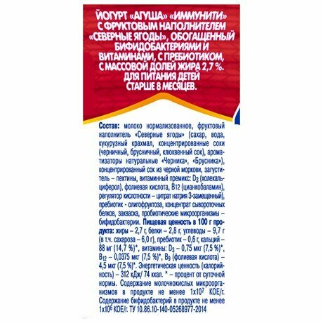 | Состав | Mолоко нормализованное, фруктовый наполнитель «Северные ягоды» (сахар, вода, крахмал кукурузный, соки концентрированные (черничный, брусничный, из черной моркови, клюквенный), ароматизаторы натуральные («Брусника», «Черника»), загуститель – пектины, витаминный премикс (D (D3-холекальциферол), фолиевая кислота, В12 (цианокобаламин)), регулятор кислотности – цитрат натрия 3-замещенный), пребиотик - олигофруктоза, концентрат сывороточных белков, закваска, пробиотические микроорганизмы – бифидобактерии ВВ12 |