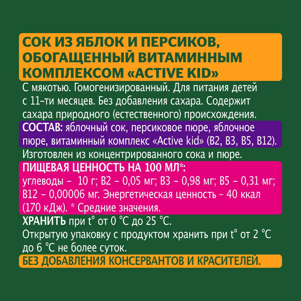 | Состав | Яблочный сок, персиковое пюре, яблочное пюре, витаминный комплекс "Active kid" (В2, В3, В5, В12). |