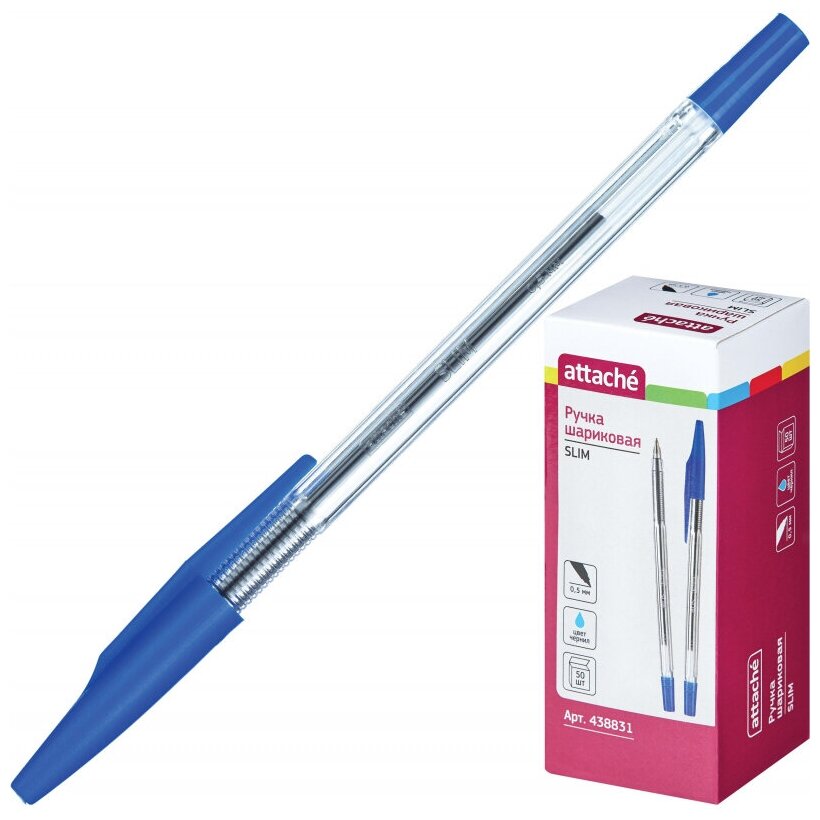 Attache Ручка шариковая Slim 0.5 мм Шариковая ручка Attache Slim с толщиной линии письма 0.5 мм. Ручка выполнена в пластиковом прозрачном корпусе и синими элементами. Обладает ребристой зоной захвата, снижающей скольжение. Колпачок вентилируемый.