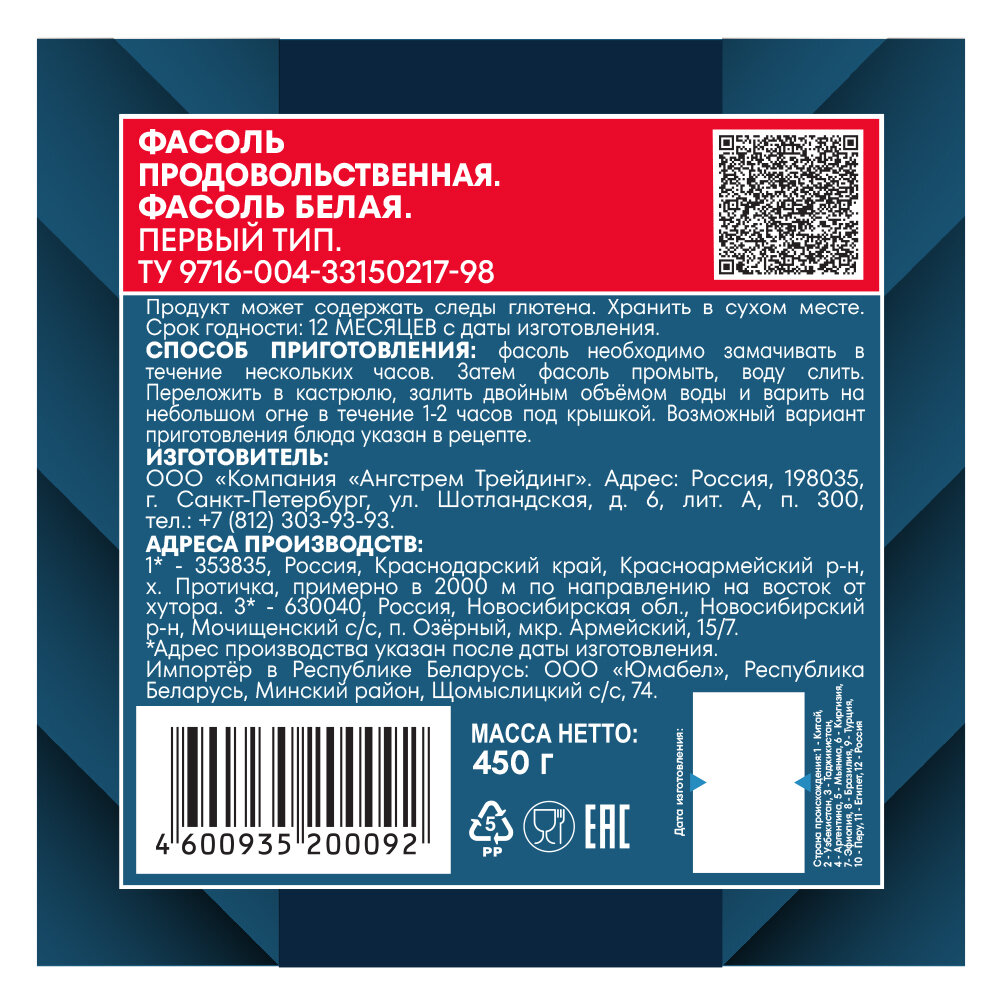 | Состав | Фасоль продовольственная. Фасоль белая. Первый тип. Возможно наличие следов глютена |