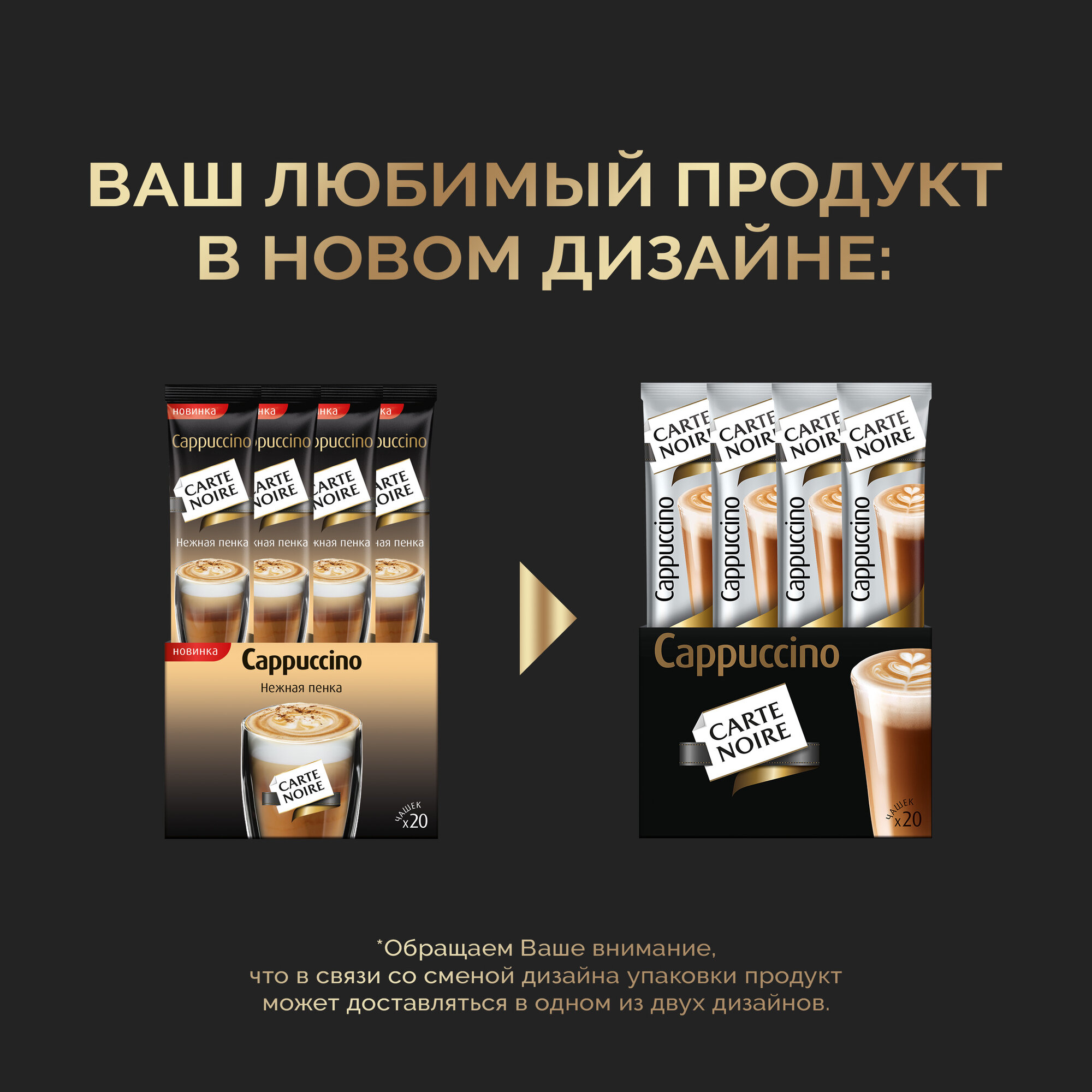 Carte Noire Cappuccino - изысканный кофейный напиток с пенкой. Нежная пенка c мягким сливочным вкусом тонко сочетается с чувственными нотками отборных кофейных зерен. Совершенное удовольствие в каждой чашке.