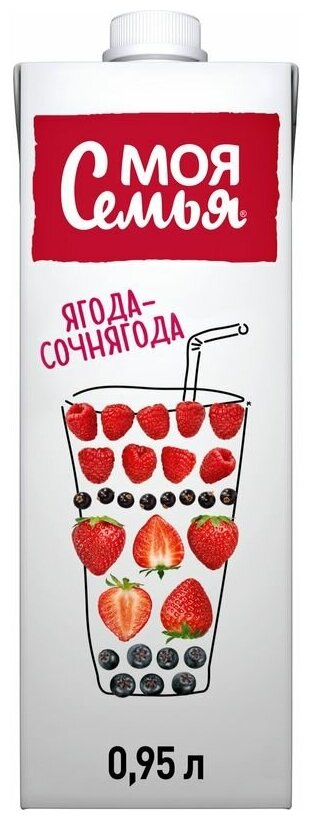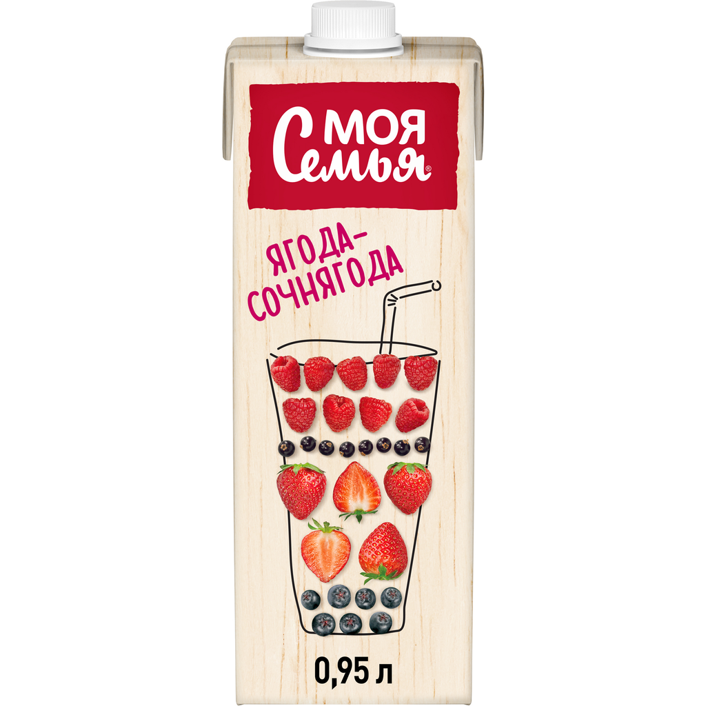 Порадуйте всю семью вкусным фруктово-ягодным миксом Моя Семья "Ягода-Сочнягода", который обладает насыщенным ярким вкусом благодаря ягодам ароматной малины, сладкой клубники и спелой черной смородины. Моя Семья "Ягода-Сочнягода" не содержит ГМО, произведен из настоящих фруктов и ягод без добавления консервантов.