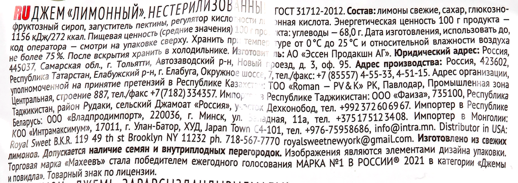 | Состав | лимоны свежие, сахар, глюкозно-фруктозный сироп, загуститель фруктовый пектин, регулятор кислотности лимонная кислота |