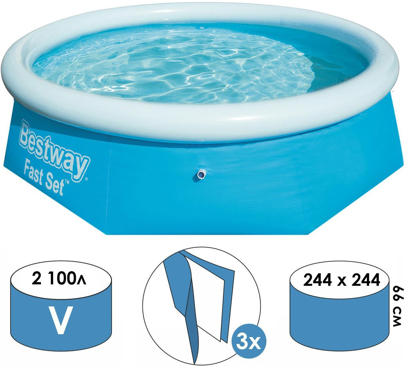 Надувной бассейн BestWay / 57008 Fast Set отличается простотой и легкостью. Стенки бассейна, выполнены из армированного ПВХ, внешний слой - полиэстер для особой прочности. Поддержка бортов осуществляется при помощи надувного кольца, которое поднимается по мере наполнения бассейна и расправляет его стенки. Для установки бассейна нужна плоская, горизонтальная площадка. Время сборки и подключения бассейна не более 10-15 минут. На холодное время года не рекомендуем оставлять бассейн на открытом воздухе.