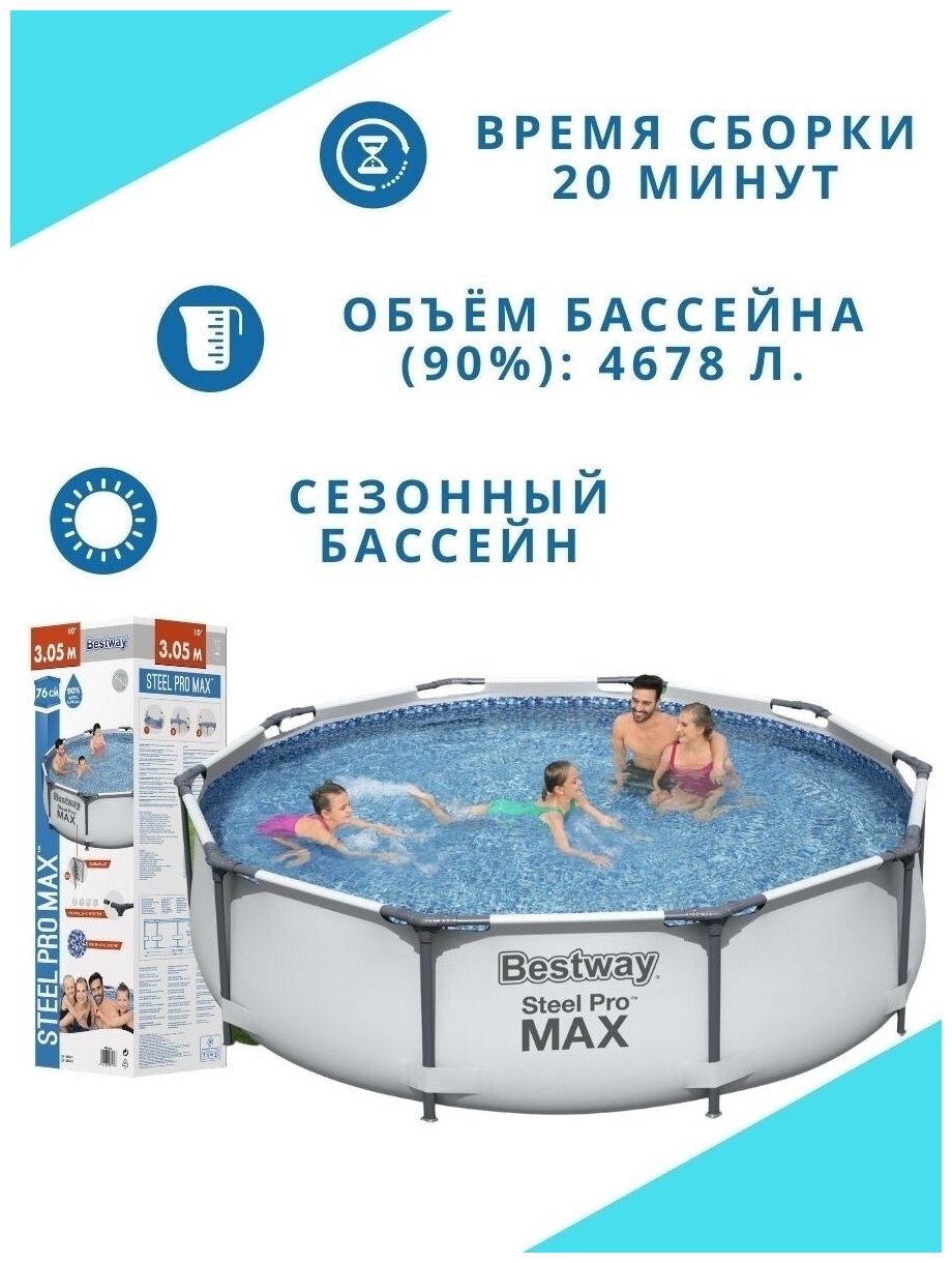 Бассейн каркасный. Не заполняйте бассейн водой больше чем на 90%. Чаша бассейна выполнена из высококачественного трехслойного ПВХ: два слоя плотного винила и один - полиэстер для особой прочности. Прочная рама легко собирается и разбирается. Это удобно для сезонного хранения. Размер: 305 х 76 см. Объем: 4678 л.