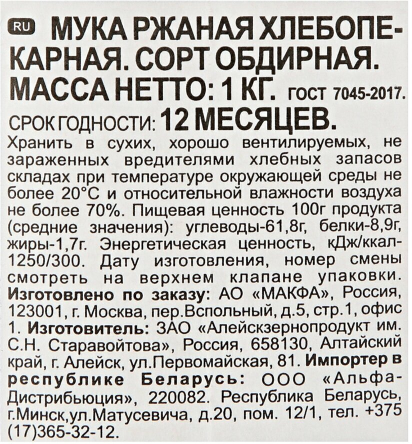 Мука MAKFA производится из отборного зерна, выращенного в экологически чистых регионах России. Обдирная ржаная мука имеет темный кремовый цвет и неоднородную текстуру, состоящую из мелких частичек зерна и крупных, хорошо видных остатков зерновой оборочки. Это наиболее полезная разновидность муки, так как при ее изготовлении используется цельное зерно вместе с оболочкой. Из ржаной муки пекут традиционные и особые хлеба, постные пироги и пирожки, делают блины, лепешки и печенье. Для получения однородного пышного теста муку следует просеять.