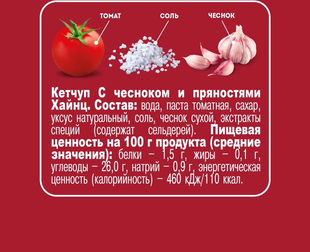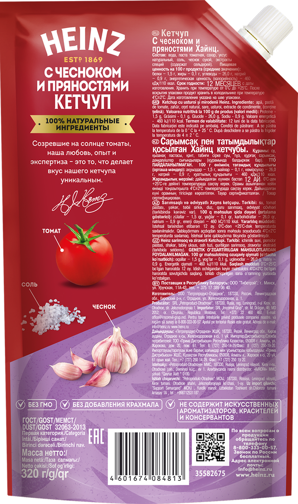 Heinz Кетчуп С чесноком и пряностями 320 г Heinz Кетчуп С чесноком и пряностями 320 г. Насыщенный вкус томатного кетчупа Heinz с чесноком и пряностями по достоинству оценят любители богатых вкусовых сочетаний.
