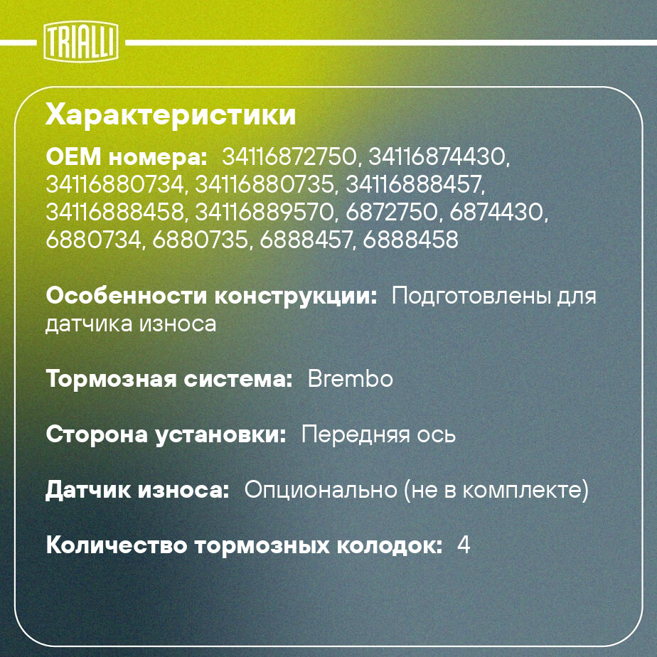 Колодки тормозные дисковые TRIALLI для BMW 3 G20/G80,5 G30/F90,7 G11/G12,X3 G01/F97 15˃ — это надёжное решение для эффективного и безопасного торможения в любых дорожных условиях. Предназначены для замены изношенных тормозных колодок, обеспечивают стабильное прижатие к тормозному диску, минимизируя риск проскальзывания и сокращая тормозной путь. Основные преимущества тормозных дисковых колодок TRIALLI: Высокая износостойкость — увеличенный срок службы за счёт применения современных фрикционных материалов. Стабильная работа при перепадах температур — эффективное торможение как в городском цикле, так и на трассе. Низкий уровень шума и вибраций — специальное покрытие и демпфирующие пластины обеспечивают тихую и плавную работу. Минимальное образование пыли — сохраняет чистоту дисков. Быстрое приработочное торможение — достигается эффективное сцепление уже с первых километров после установки. Продукция TRIALLI разрабатывается с учётом международных стандартов безопасности и проходит многоэтапный контроль качества на всех стадиях производства. При производстве используются передовые технологии, что позволяет обеспечивать стабильные эксплуатационные характеристики даже в сложных климатических условиях. Для достижения максимальной эффективности рекомендуется заменять тормозные колодки TRIALLI парами на одной оси. Перед установкой убедитесь в отсутствии повреждений на тормозных дисках и при необходимости выполните их шлифовку или замену. После монтажа новых колодок соблюдайте режим приработки: избегайте резких торможений в первые 200–300 км, чтобы обеспечить равномерное прилегание фрикционного материала к диску. Регулярно проверяйте уровень тормозной жидкости и состояние направляющих суппортов для предотвращения закисания и неравномерного износа.
