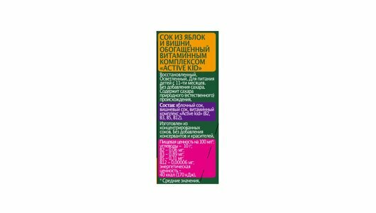 | Состав | Яблочный сок, вишневый сок, витаминный комплекс "Active kid" (В2, В3, В5, В12). |