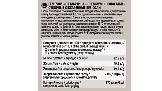 Полосатые семечки «От Мартина» проходят тщательный процесс обжарки. Чистый и натуральный вкус отборных семян подсолнечника без добавления соли. Кожуру перед употреблением необходимо очистить. Герметичная упаковка — сохраняет свежесть продукта. Идеально — для быстрого перекуса в течение дня или как закуска к фильму.