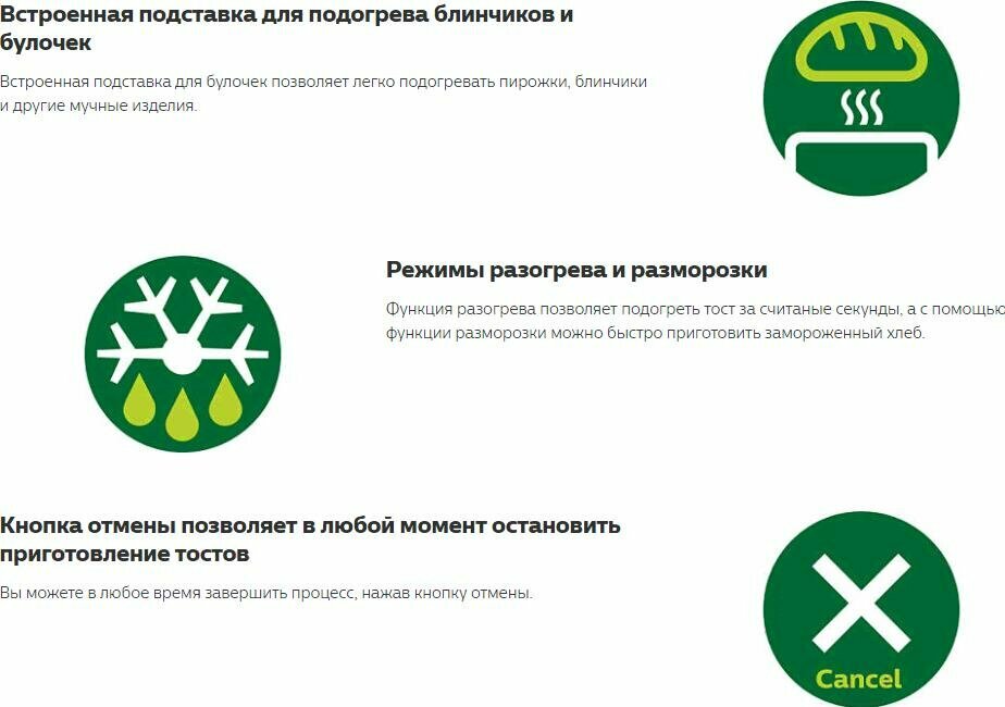 | Удобство в использовании | отсек для сетевого шнура, автоотключение, автоматическое центрирование продуктов, поддон для крошек, термоизолированный корпус |