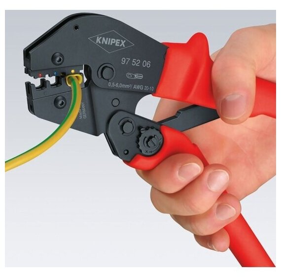Ручной обжимник KNIPEX позволяет выполнять опрессовку электрических контактов без применения пайки. Создает овальный обжим высокого качества. Для облегчения работы предусмотрены удлиненные рукоятки эргономичной формы с чехлами из пластмассы, которые препятствуют скольжению. Дополнительные характеристики Диапазон: 0.5-6.0 мм; Количество гнезд: 3; Овальный обжим. Технические характеристики обжимников Knipex Тип для изолированных наконечников Снятие изоляции нет Винторез нет Сечение изол. наконечников, мм² 0.5-6 Тип разъёма RJ нет (нет разъема RJ) Разъемы F и BNC нет Габариты без упаковки, мм 250 Вес нетто, кг 0,565 Преимущества обжимников Knipex Инструмент выполнен из хромованадиевой электростали особого качества, закаленной в масле, что делает его прочными и долговечными; Раскрывающаяся пружина - для удобства в использовании; Высокое качество опрессовки за счет принудительной блокировки с фиксацией; Благодаря новому передаточному отношению рычагов на 30 % снижено усилие, по сравнению с аналогичным инструментом; Продуманная конструкция ручек, наклон головки, центр тяжести уравновешен - удобство в работе; На рукоятках чехлы из пластмассы - для безопасной работы; Для кабельных, кольцевых изолированных наконечников и штекеров; Возможность работы с AWG (американский калибр проводов): 20-10; Давление прецизионно установлено производителем (регулируется).