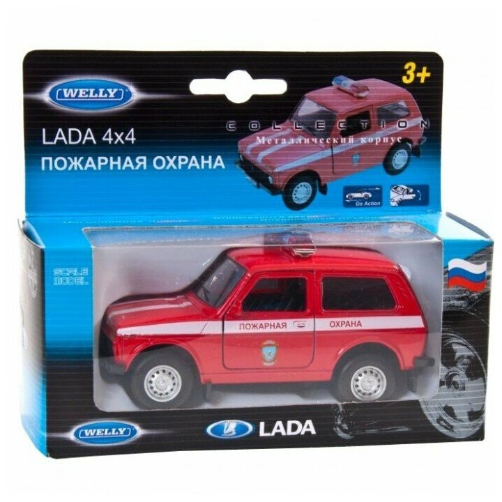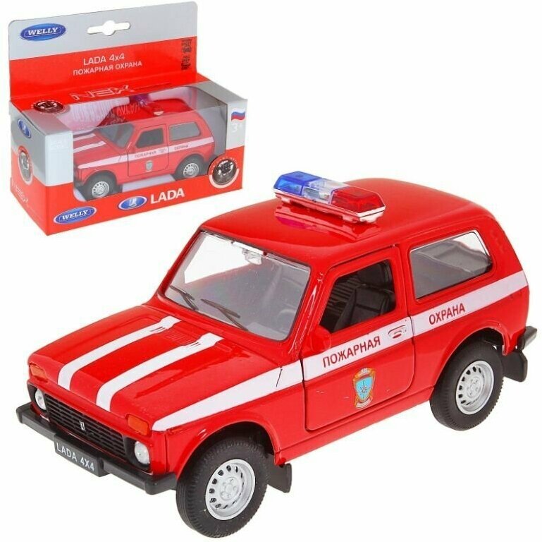 Модель машины 1:34-39 Welly Lada 4x4 Пожарная охрана это коллекционная модель, которая является копией настоящего автомобиля. Она изготовлена из металла с элементами пластика. У машинки открываются двери, двигаются колеса. Машинка является отличным подарком не только ребенку, но и коллекционеру. Однако, во время игры с такой машинкой у ребенка развивается мелкая моторика рук, фантазия и воображение.