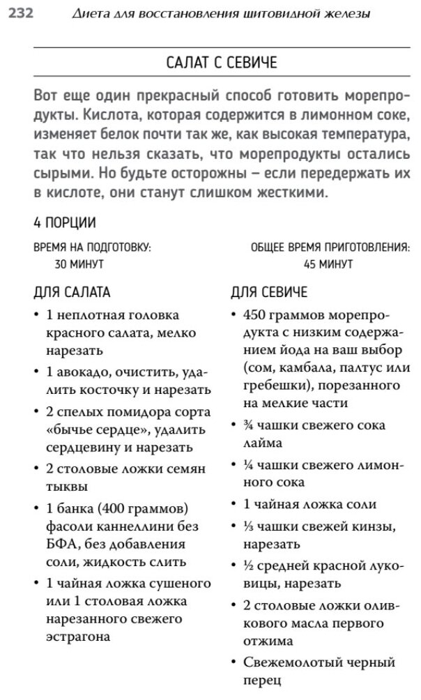Удивительно, на первых же строках я прочитала ту информацию, которую знала еще со школы, но совершенно наоборот. Вся книга уделена восстановлению щитовидной железы с помощью новых методов, нет, не медикаментов, а диетой, но современной и отношением к йоду. Симптоматика заболевания щитовидной железы скорее всего будет вам знакома: слабость, стоячий лишний вес, холод в конечностях, сухая кожа и тд. Хоть диета и является инновационной, это не волшебная таблетка, а все та же диета - план питания и разрешенные продукты, которые отслеживаете исключительно вы сами. Автор составил списки с продуктами, которые разделил на разрешенные, ограниченно разрешенные и неразрешенные, а так же составил таблицы с разнообразным правильным рационом на 28 дней. Вместе с этим в книге вы найдете множество рецептов блюд. Неправильный рацион пищи автор рассмотрел на примере среднестатистического американского меню и обратил внимание на те ошибки в питании, которые мы все совершаем ежедневно. В холодные сезоны года люди чаще обращают внимание на усталость, сонливость и лишний вес, поэтому сейчас есть еще больше желания разобраться с тем, что не так мы делаем с организмом.