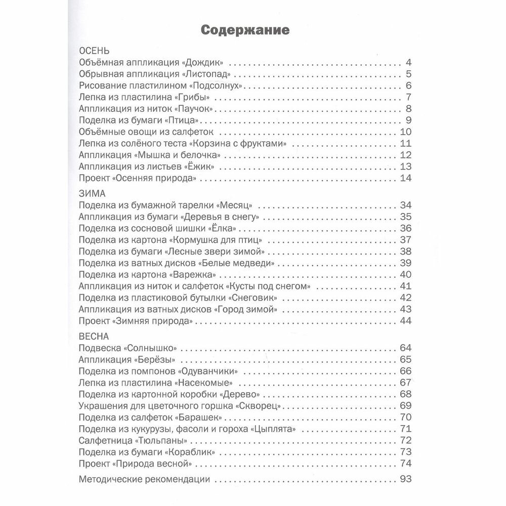 В рабочую тетрадь включены 33 занятия, распределенные по временам года: осень, зима, весна. В каждом задании есть перечень необходимых материалов и оборудования, изложен ход работы. В приложении имеются красочные основы поделок, шаблоны и детали изделий.