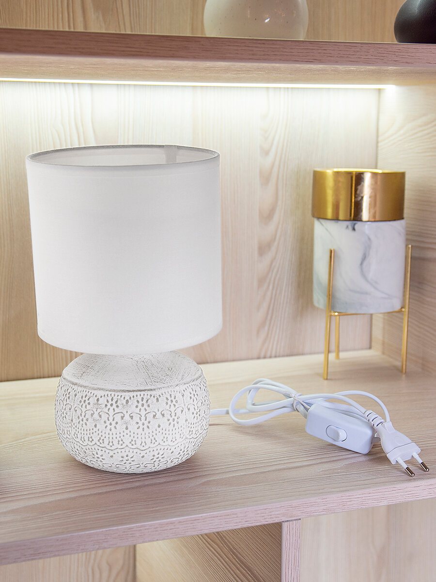 Лампа настольная с выключателем на проводе, хорошо впишется и украсит любой интерьер. Размер светильника: диаметр 15 см, высота 26 см. Патрон (цоколь) под Е14, миньон. В светильнике можно использовать лампочку накаливания максимальной мощностью не более 40 Вт. Светодиодные лампочки без ограничений. Длина провода вместе с вилкой 130 см. Материал абажура внутренний слой светотехнический пластик, наружный слой ткань. Материал основания керамика. Настольный светильник отлично подойдет на тумбочку в спальне. Украсит интерьер зала, часто устанавливают, как дежурный свет в коридорах и кухнях. Прикроватная лампа лючия имеет стильный и оригинальный дизайн. Прикроватный светильник помимо источника света является неповторимым предметом декора для дома. Подарить прикроватный светильник - это отличная идея. Абажур крепится прижимным кольцом, накрученным на цоколь для лампочки. Необходимо открутить кольцо, надеть плафон, закрутить кольцо.