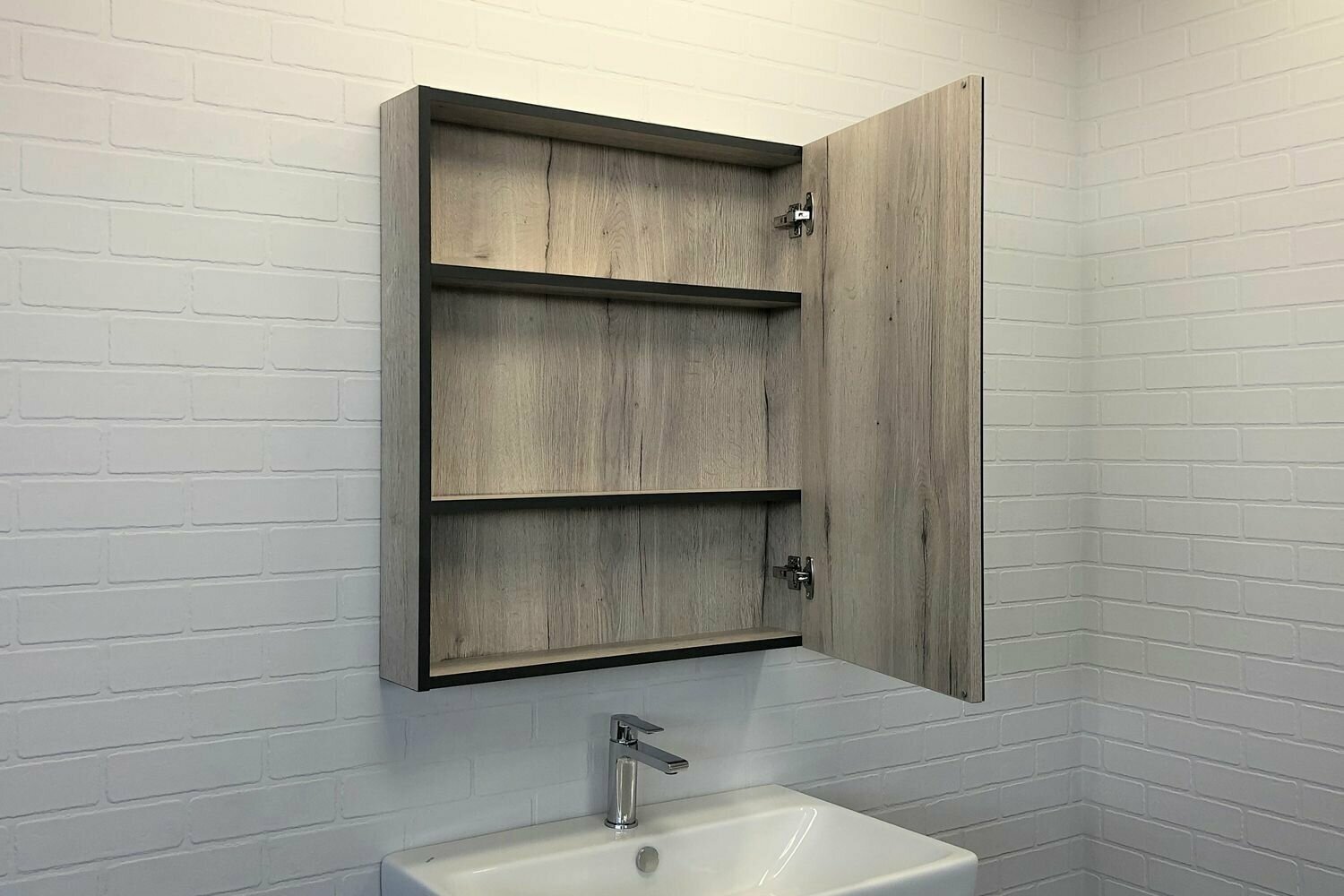 Зеркальный шкаф. Цвет-дуб дымчатый. Габариты (ШхВхГ): 700*800*150 мм. Высококачественное зеркальное полотно с амальгамой на основе серебра. Створка оснащена петлями с плавным закрыванием. Петли у створки снаружи. За зеркальной створкой одна горизонтальная полка, в пространстве открытого хранения - две. Зеркальный шкаф универсальный - может быть подвешен в правом и левом варианте