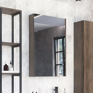 Зеркальный шкаф. Цвет-дуб дымчатый. Материал корпуса мебельного элемента: влагостойкое ЛДСП. Габариты (ШхВхГ): 715*800*145 мм. Зеркальное высококачественное полотно с амальгамой на основе серебра. Створка мебельного элемента оснащена петлями с системой плавного закрывания. За дверцей две горизонтальные полки. Зеркальный шкаф универсален - может быть подвешен в правом или левом варианте переворачиванием