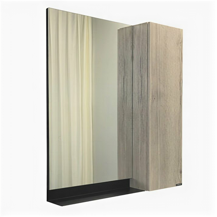 Зеркальный шкаф. Цвет-дуб дымчатый, графит. Материал корпуса мебельного элемента: влагостойкое ЛДСП. Габариты (ШхВхГ): 730*800*140 мм. Зеркальное высококачественное полотно с амальгамой на основе серебра. Створка мебельного элемента оснащена петлями с системой плавного закрывания. За дверцей одна горизонтальная полка. Зеркальный шкаф состоит из двух отдельных элементов: зеркала и шкафчика - поэтому универсально, может быть подвешено в правом или левом варианте. Полка зеркала из металла окрашенного в графит