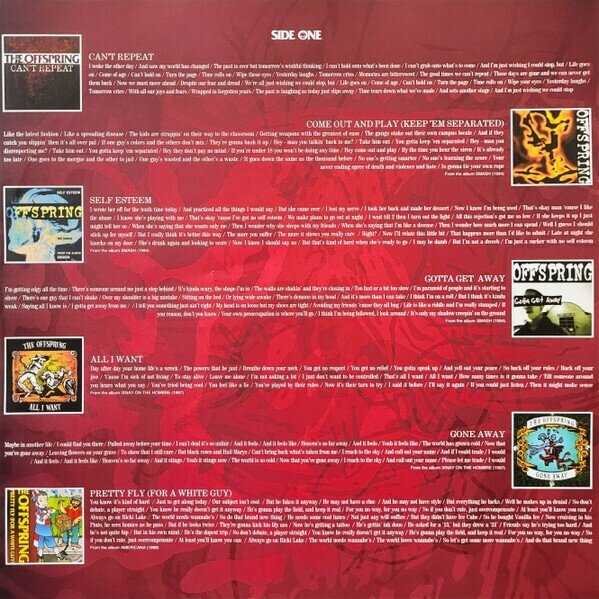 The Offspring - Greatest Hits (Compilation, Stereo) LP«The Offspring - Greatest Hits» - сборник хитов американской панк-рок группы The Offspring. The Offspring — знаменитая американская панк-рок-группа из Гарден-Гроув, Калифорния, образованная в 1984 году. Первоначально сформированная под названием Manic Subsidal. Первоначально группа состояла из ведущего вокалиста и ритм-гитариста Брайана «Декстера» Холланда, басиста Тодда Морса и ведущего гитариста Кевина «Нудлс» Вассермана. За свою 38-летнюю карьеру The Offspring выпустили 10 студийных альбомов, а также претерпели ряд изменений в составе, в первую очередь с барабанщиками. Их ударником дольше всех был Рон Велти, который заменил оригинального барабанщика Джеймса Лилью в 1987 году и оставался в The Offspring 16 лет; В 2003 году Велти заменил Атом Уиллард, а четыре года спустя бывший барабанщик Пит Парада. Грегори «Грег К.» Крисель, один из сооснователей Offspring, был их басистом до 2018 года, когда его уволили из группы из-за деловых споров, оставив Холланда единственным оставшимся первоначальным участником коллектива. Криселя заменил Тодд Морс из H2O, который был гастрольным гитаристом Offspring с 2009 года. The Offspring часто приписывают - наряду с другими калифорнийскими панк-группами Green Day и Rancid - возрождение массового интереса к панк-року в 1990-х. Они продали более 40 миллионов пластинок по всему миру, что сделало их одной из самых продаваемых панк-рок-групп в истории музыки. После того, как их ранние релизы, включая одноименный дебютный альбом 1989 года и виниловый EP «Baghdad» (1991), завоевали местных поклонников, The Offspring подписали контракт с Epitaph Records и выпустили два альбома для независимого лейбла, «Ignition» (1992) и «Smash». (1994). «Smash», который содержал первый крупный хит группы "Come Out and Play", сделал панк-рок популярным и считается одним из самых продаваемых альбомов, выпущенных на независимом лейбле, продано более одиннадцати миллионов копий по всему миру. Успех «Smash» привлек внимание крупных лейблов, в том числе Columbia Records, с которой The Offspring подписали контракт в 1996 году; их первый альбом для лейбла, «Ixnay on the Hombre» (1997), не имел успеха своего предшественника, но получил признание критиков, а также золотые и платиновые награды. Пятый альбом группы, «Americana» (1998), восстановил прежний уровень популярности группы, получив поддержку MTV и радио, и было продано более пяти миллионов копий в США. С тех пор The Offspring выпустили еще пять альбомов: «Conspiracy of One» (2000), «Splinter» (2003), «Rise and Fall, Rage and Grace» (2008), «Days Go By» (2012) и «Let the Bad Times Roll» (2021). TracklistA1 Can't RepeatA2 Come Out and PlayA3 Self EsteemA4 Gotta Get AwayA5 All I WantA6 Gone AwayA7 Pretty FlyB1 Why Don't You Get A Job? B2 The Kids Aren't AlrightB3 Original PranksterB4 Want You BadB5 Defy YouB6 .
