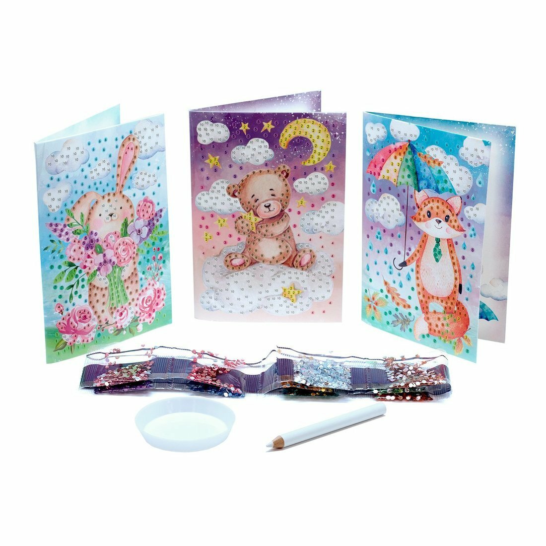 Состав набора | 3 открытки с клеевой основой, карандаш-стилус, тарелочка, стразы |