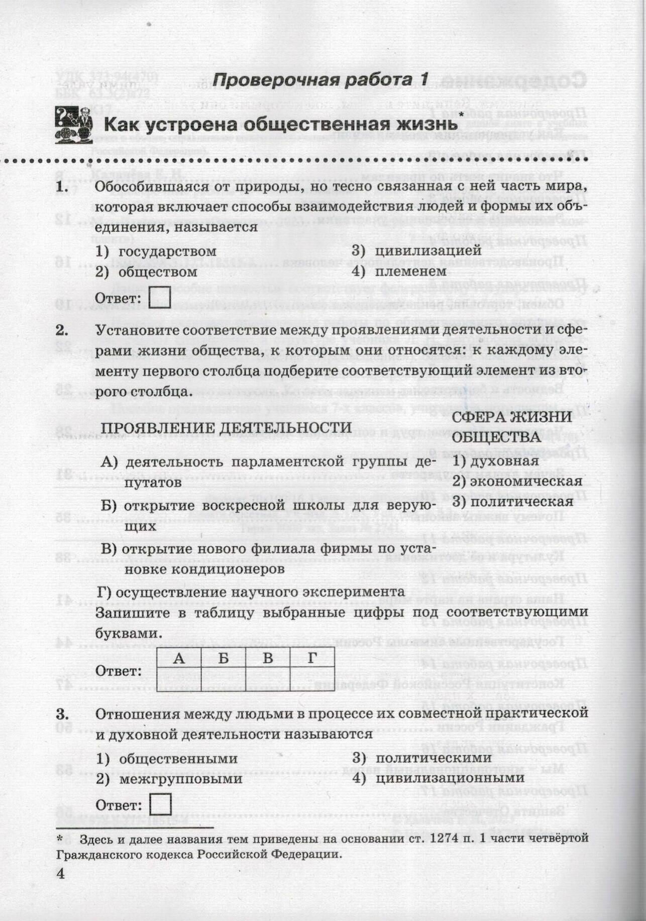 Пособие включает проверочные работы по обществознанию, которые соответствуют содержанию и структуре учебника Л. Н. Боголюбова "Обществознание. 7 класс" (издательство "Просвещение"). Задания можно использовать для обучения и самоконтроля учащихся, проверки домашних заданий, текущего и итогового контроля. Ко всем заданиям даны ответы.