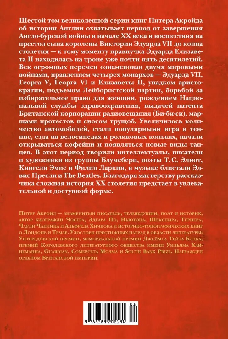 История Англии Питера Акройда - великолепный пример исторической публицистики. Автор создал галерею из истории личностей, политических деяний, развития веры, философии, литературы. Последний том серии посвящен ХХ веку, значительную часть которого пришлось на правление Елизаветы II. Книга интересная хотя бы тем, что многие из читателей родились в это время и могут сравнить свои воспоминания с материалами книги. А ещё - эта книга дарит возможность погрузиться в атмосферу Британии, достигшей пика развития, затем переживающей драму прощания с империей, преодолением травмы и возрождения ее словно феникс. Книга, безусловно, будет интересна как широкому кругу читателей, так и специалистам.