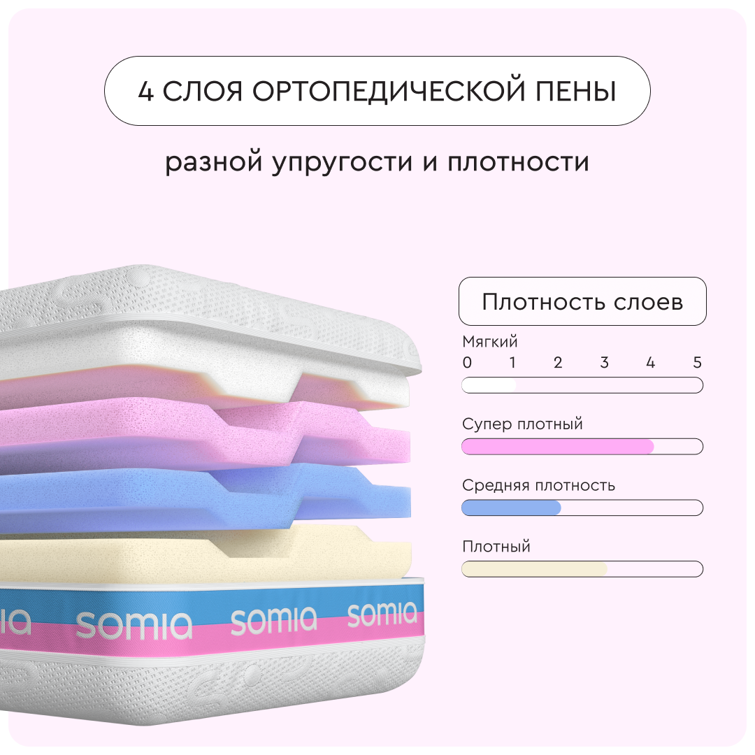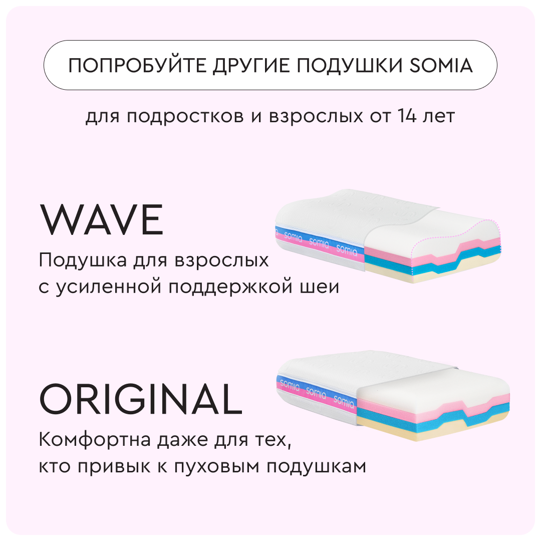 Somia Kids — ортопедическая подушка, которая растет вместе с ребенком и создает благоприятный сон в любом его возрасте. Имеет 4 слоя разной упругости и плотности и 10 комбинаций для персонального комфорта.