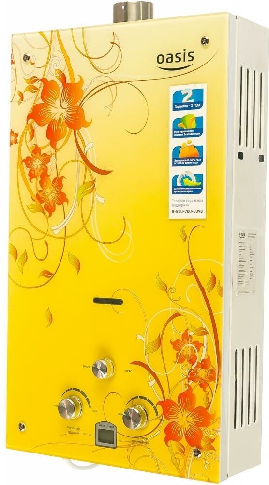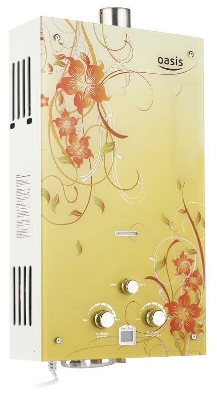 Oasis Glass BG20 - стильный газовый проточный водонагреватель для горячего водоснабжения. Принцип его работы достаточно прост: вода проходит через теплообменник прибора и моментально нагревается от сгорающего газа, поступая к потребителю уже горячей. Oasis подходит для любых квартир и частных домов, оборудованных дымоходом. Автоматический розжиг от батареек помогает избавиться от неудобств при неожиданном отключении электричества. Работа прибора осуществляется на природном газе.