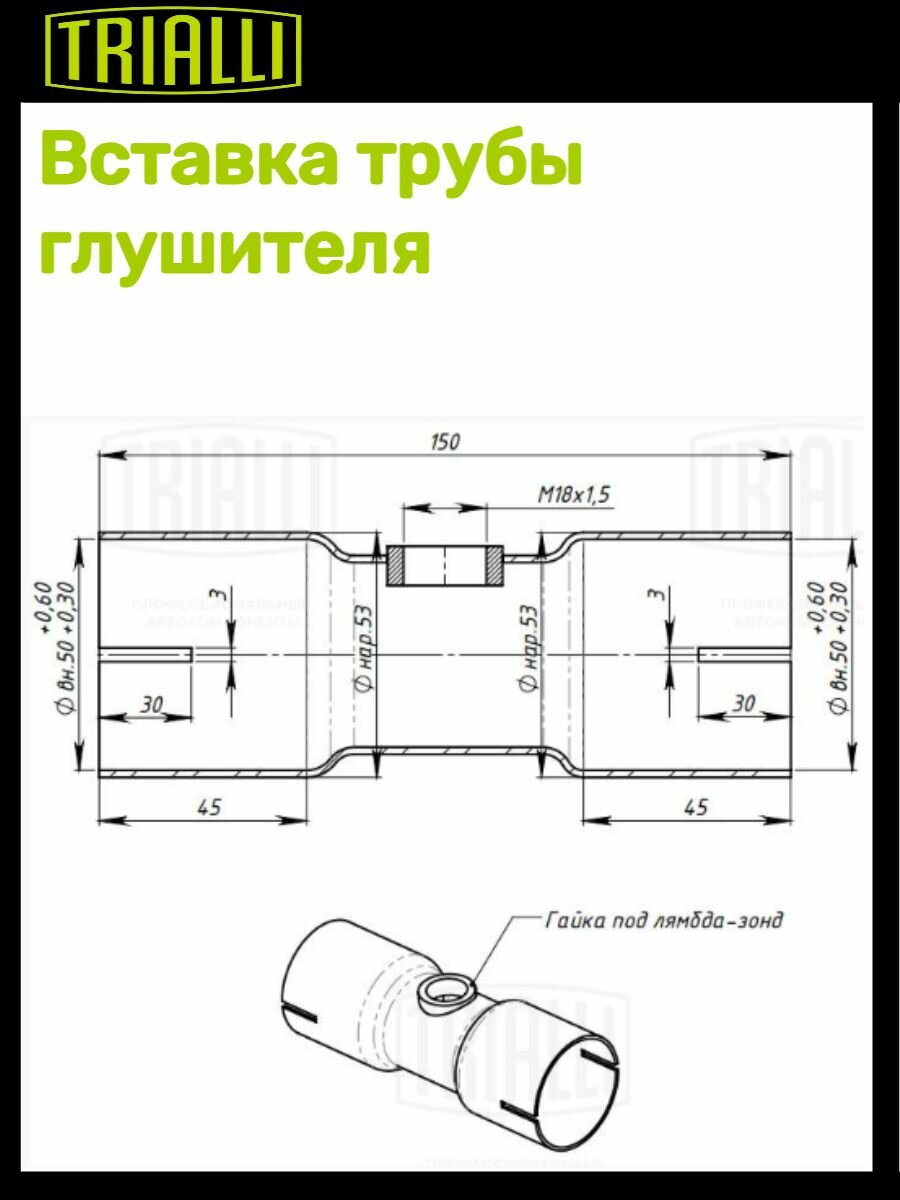 Вставка трубы глушителя под хомут с гайкой под лямбда-зонд (алюминизированная сталь) d=50 L=150мм TRIALLI (EMP 50150)