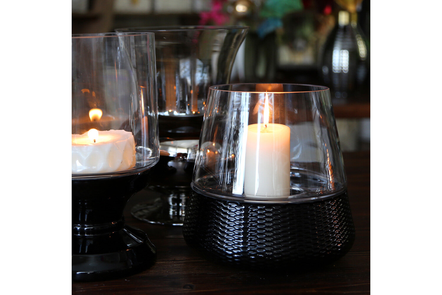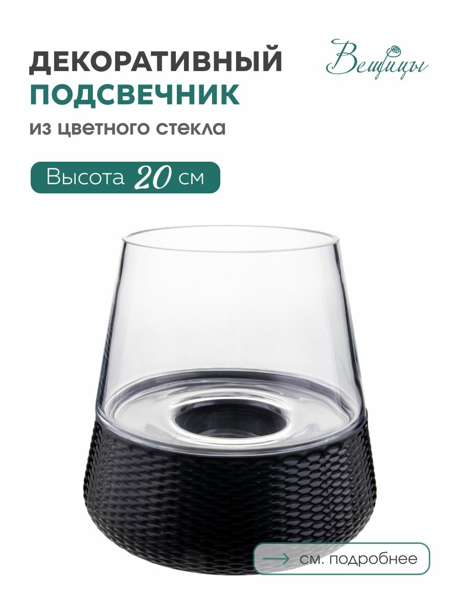 Вещицы Декоративный подсвечник из цветного стекла Добавьте в интерьер новое глубокое звучание с помощью декоративных стеклянных подсвечников. Игра света на стенках изделий разбудит воображение, цветовое решение в бело-черных или серебристых оттенках гармонично дополнит оформление любого пространства. Традиционное темное основание изделия ассоциируется со средневековыми замками и старинными подсвечниками, разгоняющими тьму. Живой огонь в доме – это напоминание об уютном очаге, который собирал, защищал и оберегал всю семью. Благодаря сужающейся кверху форме, подсвечники надежно скрывают пламя, так что поставить их можно даже рядом с книгами или салфетками.