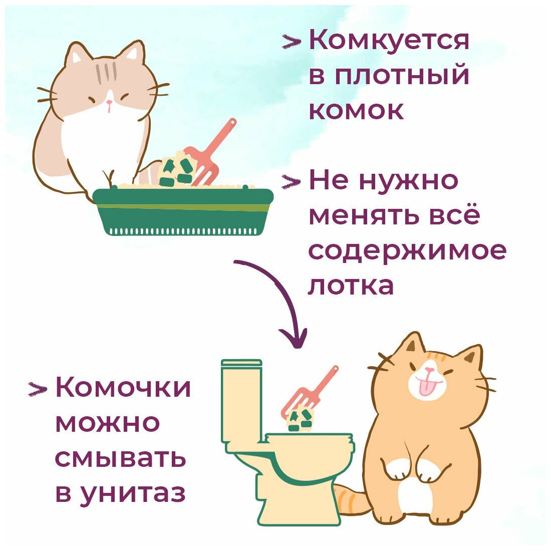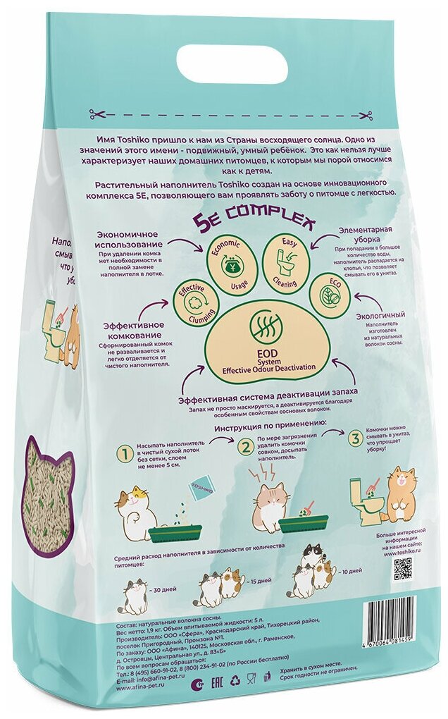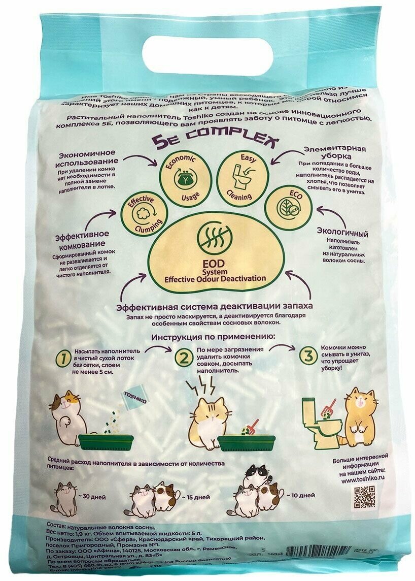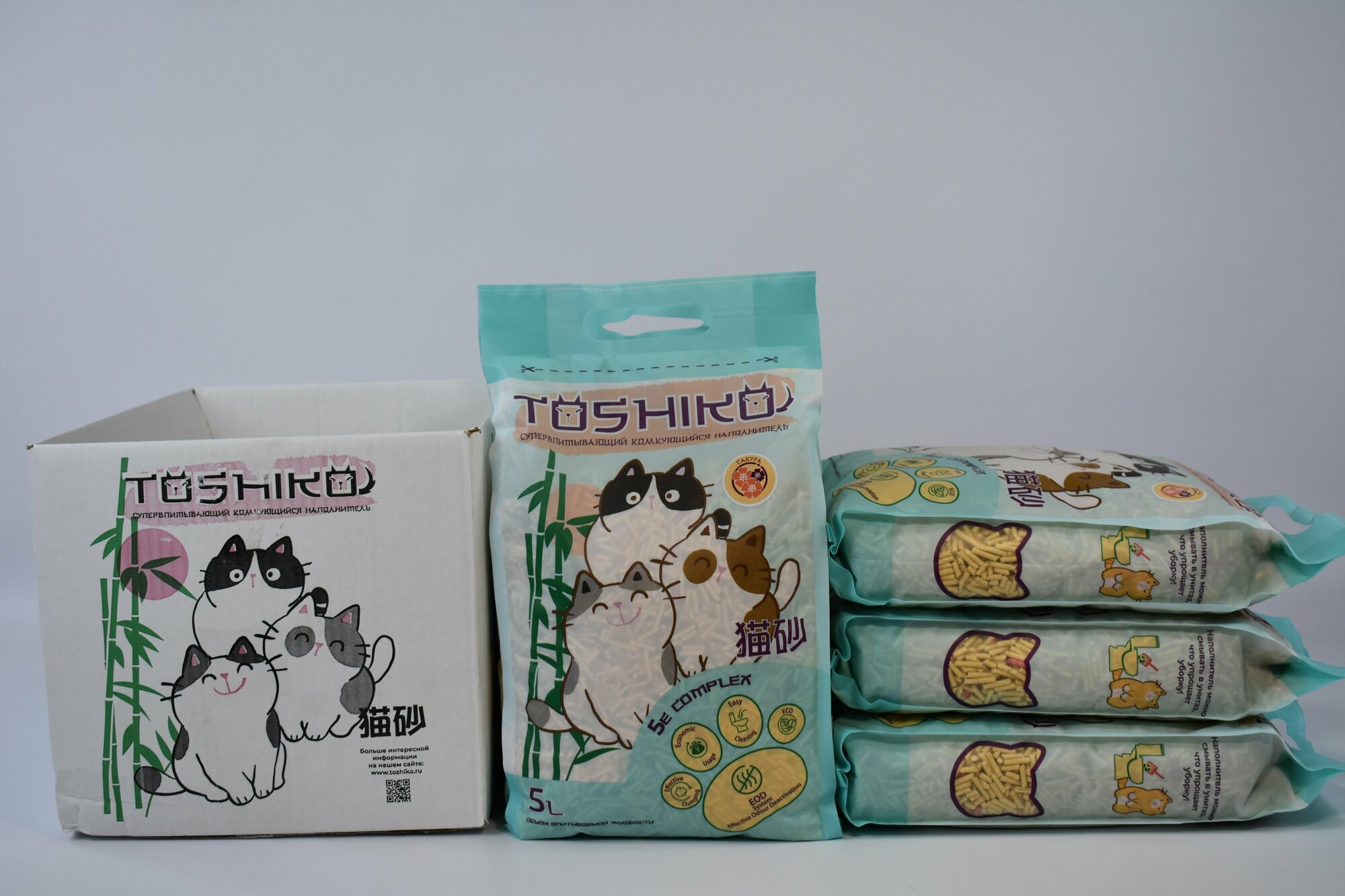 Растительный наполнитель Toshiko (Тошико) изготавливается из органических волокон хвойных пород деревьев и создан на основе инновационного комплекса 5E, позволяющего Вам проявлять заботу о питомце с легкостью. При попадании жидкости наполнитель образовывает плотный комок, который можно утилизировать в канализацию и нет необходимости в полной замене наполнителя в лотке. Не содержит вредных добавок или химических составляющих. Toshiko Зеленый чай обладает ненавязчивым ароматом свежего зелёного чая, а неприятные запахи не просто маскирует, а деактивирует.
