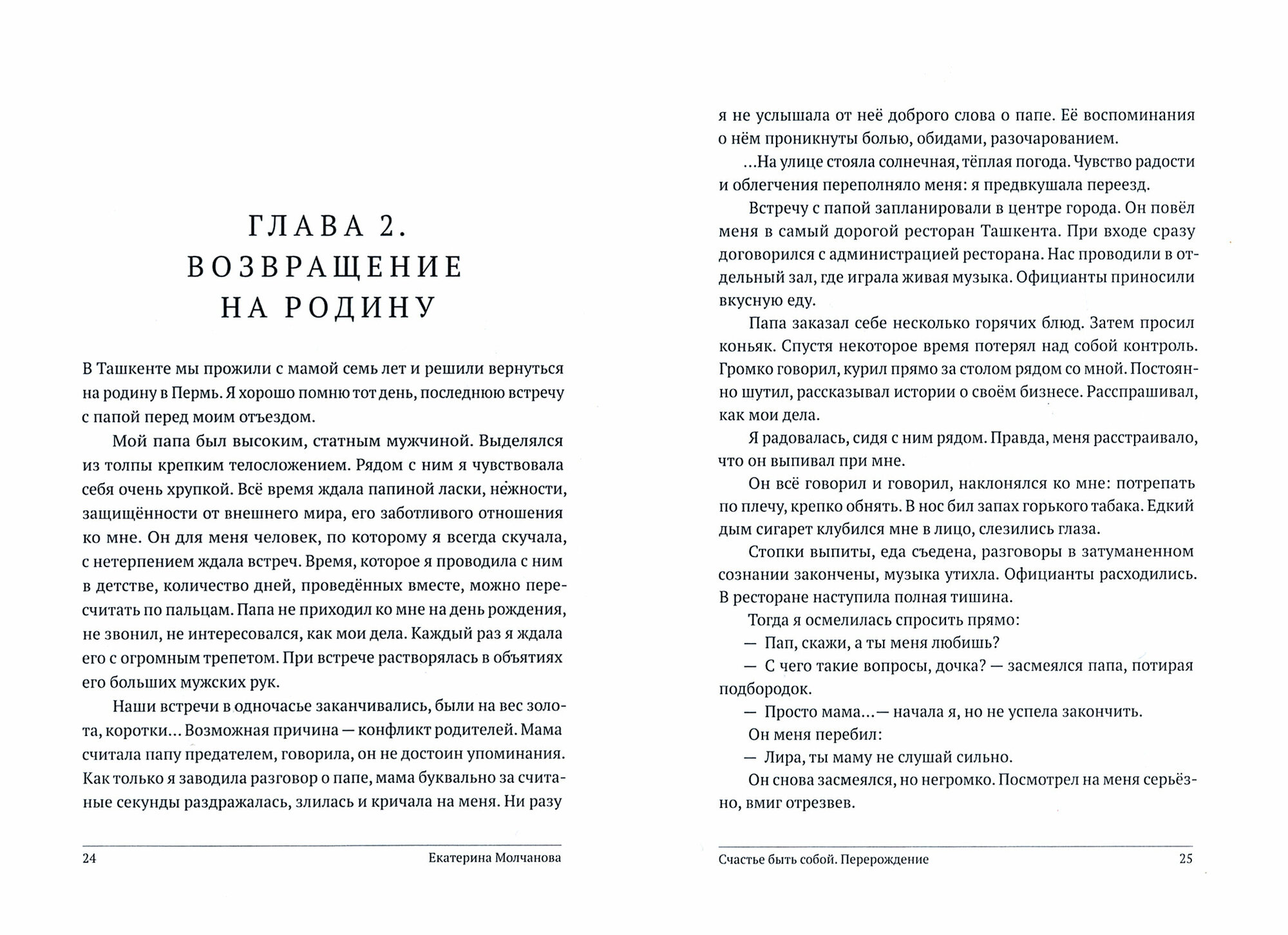 "Счастье быть собой. Перерождение" - книга, которая доказала, что интересное и остросюжетное необязательно синонимы. Я это уже почти забыла. Впрочем, пока писала рецензию, вдруг осознала, что острота в этом произведении все же имеется. Но острота не надуманная, не в стиле экшна, а правдивая, как в реальности. И от того уколы пера Екатерины Молчановой часто попадают в цель - сердце читателя, становясь довольно болезненными.