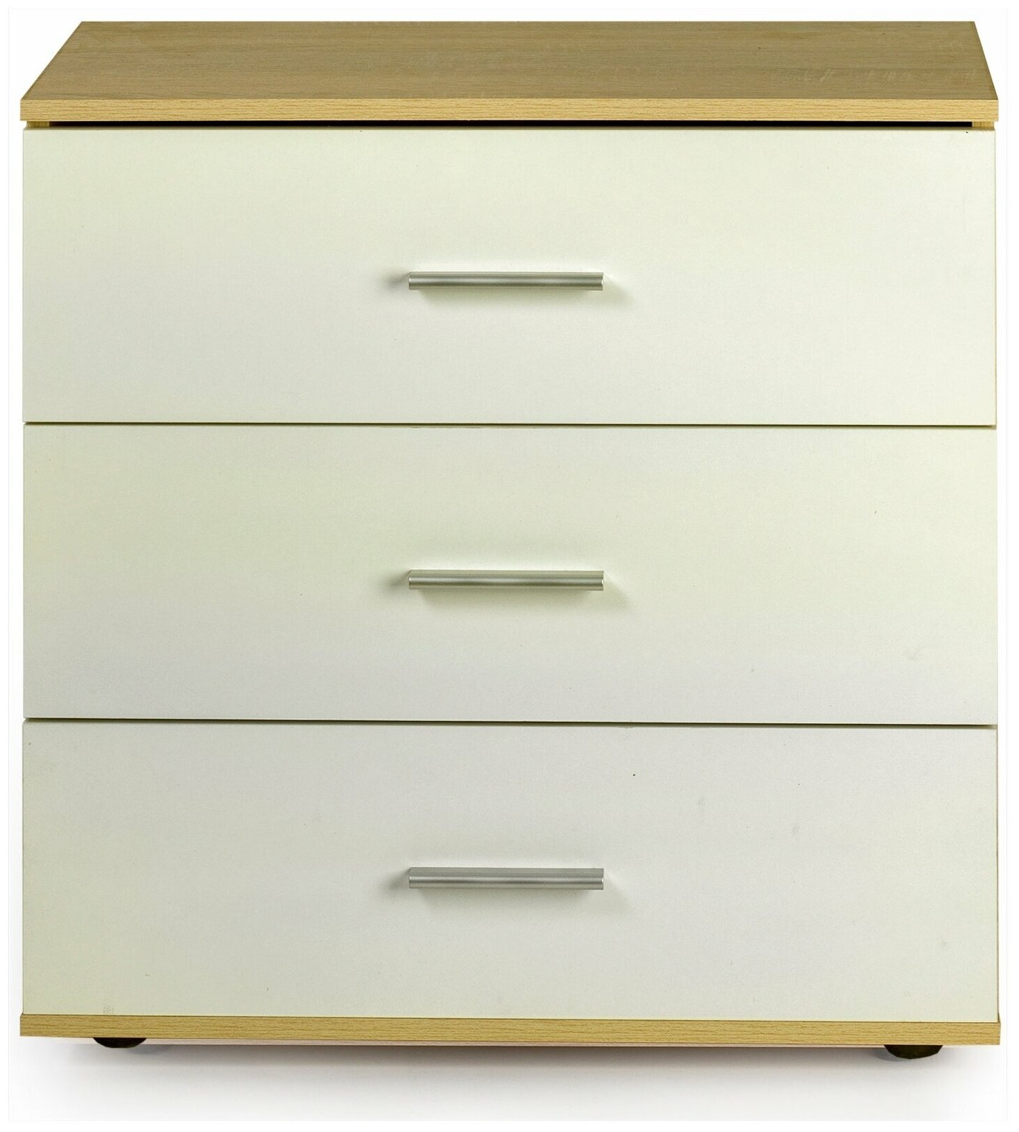 Каркас выполнен в белом цвете, а фасад украшен оригинальным тиснением. На верхней поверхности можно разместить различные предметы интерьера, например, вазы или статуэтки. Также изделие оснащено тремя выдвижными ящиками, которые предназначены для хранения одежды и постельного белья. Модель поставляется в разобранном виде, что облегчает процесс транспортировки и монтажа.