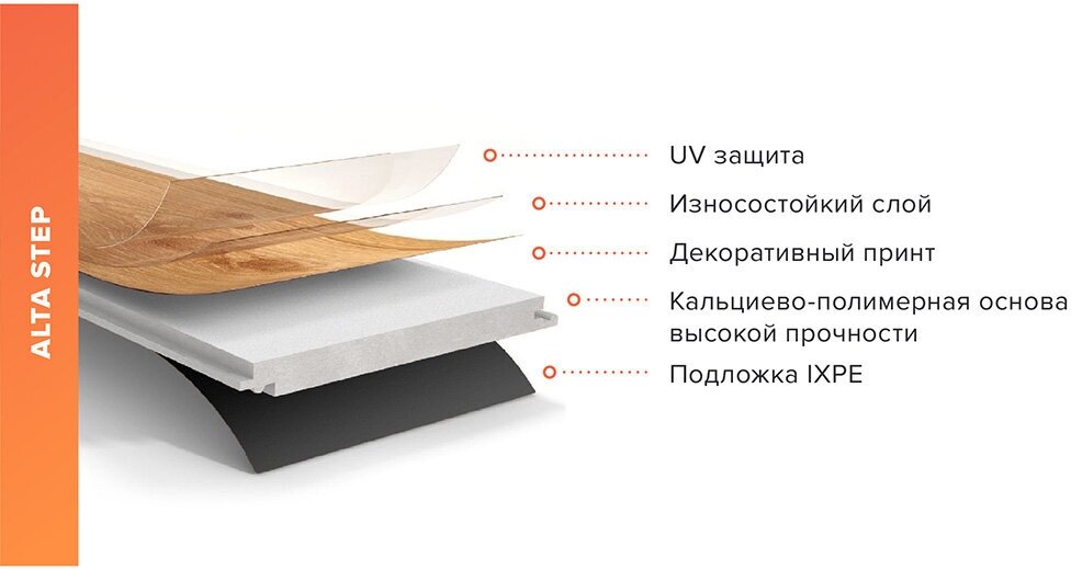 Виниловый ламинат Alta Step выглядит как натуральный мрамор с выраженной текстурой. Прочное водостойкое напольное покрытие, в основе которого лежит SPC основание, одно из самых прочных на сегодняшний день. С SPC напольного покрытия легко смываются следы от детских фломастеров или последствий вечеринки. Он не выгорает на солнце и выдерживает перепады температуры.