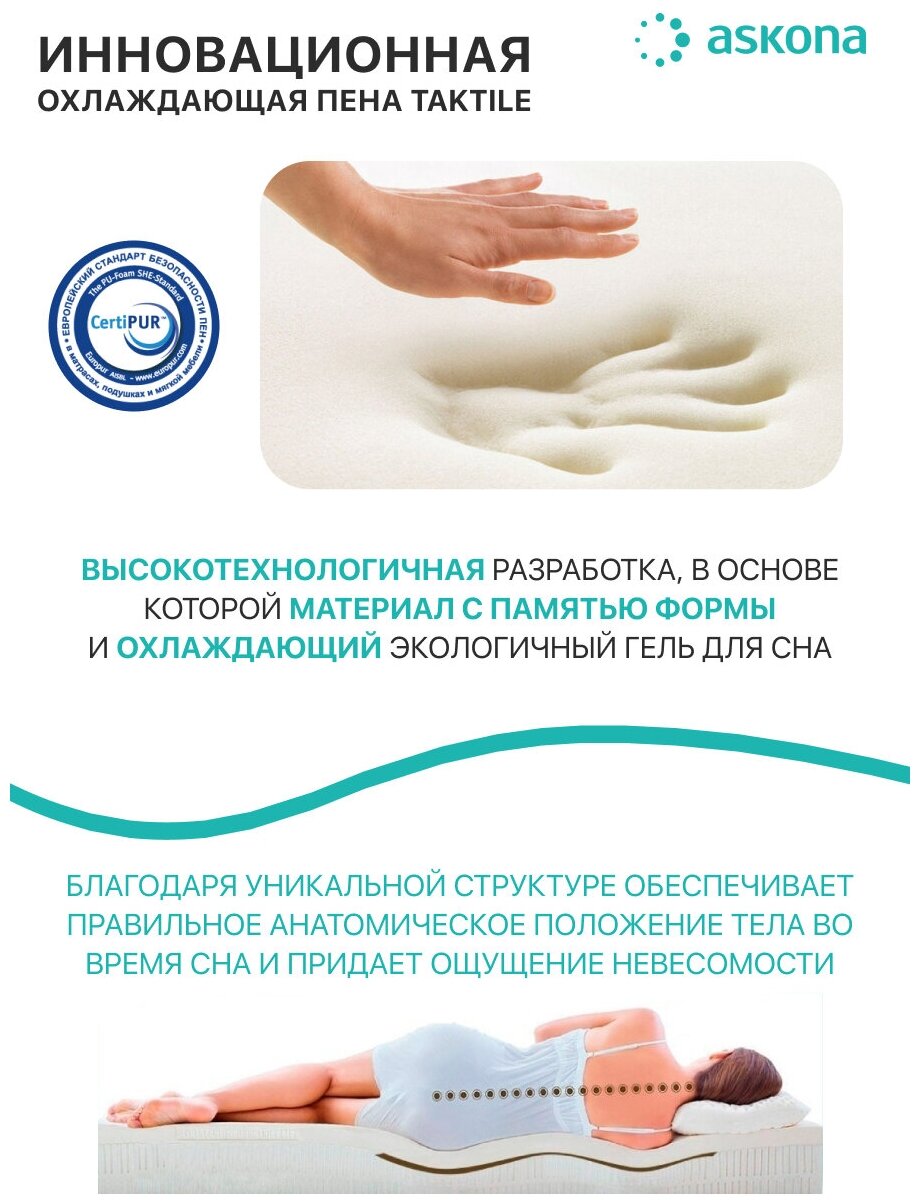 Подушка Askona рекомендована для сна на боку или спине. Она идеально подходит для взрослых и детей, обеспечивая оптимальную поддержку позвоночника и шеи во время сна.