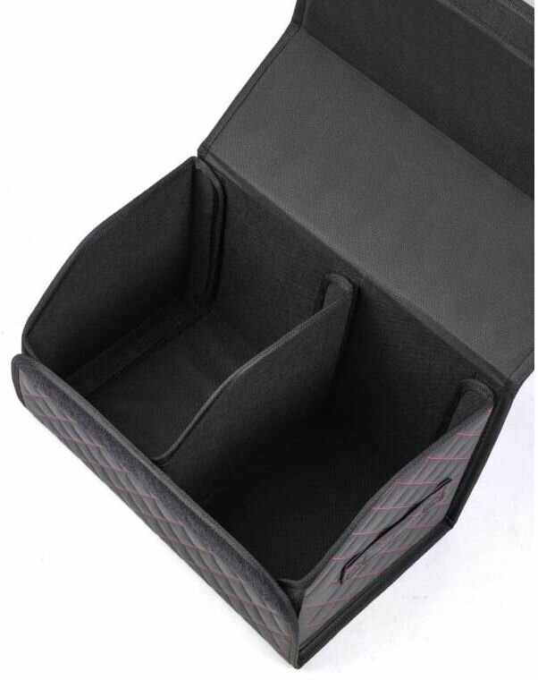 Органайзер предназначен для обеспечения порядка в багажнике автомобиля. Оснащён откидной крышкой и способен скрыть в себе 5л бутылки/канистры, а также все необходимые вещи. Органайзер изготовлен из высококачественной экокожи, простёганной в виде ромба, что придает ему элегантный, богатый вид. Внутри возможно установить перегородку для раздельного хранения вещей. По бокам расположены крепкие ручки для его переноски, а нижняя и задняя липучка надежно зафиксирует его к ворсовому покрытию багажника.