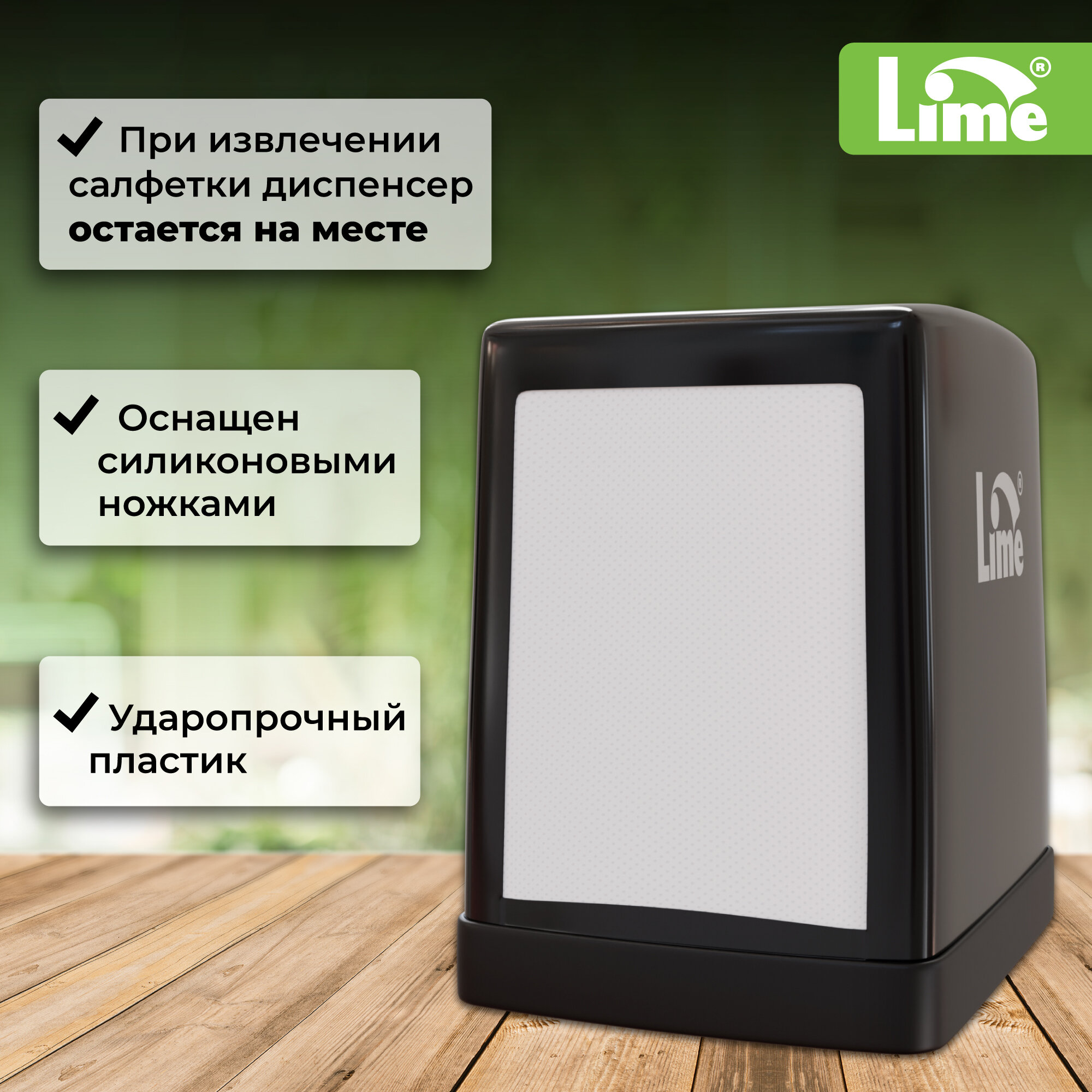 Настольный диспенсер для бумажных салфеток Lime - компактная салфетница из ударопрочного пластика, с двухсторонней или одностроронней подачей и полистовым отбором.Вместительность от 100 до 200 листов, в зависимости от размеров расходных материалов.Представлен в нашем ассортименте в трех цветах: белый, серый и черный.Размер диспенсера: 13.5*13,5*10,5 см.Размеры совместимых салфеток в развернутом виде: 18х24 см и 18х16 мм. В сложенном: 12х8 см.Оснащен силиконовыми ножками.Поштучная подача и легкость загрузки реализованы за счет встроенного дозатор а с пружиной.Держатель для салфеток Lime - практичное решение для предприятий общественного питания, кафе, столовых, а также для домашнего или офисного применения.В Хореке (HoReCa) он уже давно знаком, вы наверняка не раз встречали наш диспенсер в различных точках общепита. Это не просто красивый предмет декора, а и функциональное, удобное приспособление, обладающее следующими преимуществами:- экономия: нет возможности вытащить сразу несколько листов, салфетки аккуратно вытягиваются по одной штуке;- гигиена: присутствует контакт только с одной салфеткой, остальные недоступны для соприкосновения;- быстрота обслуживания в местах с высокой проходимостью, заправка и дозаправка диспенсера занимает всего несколько секунд, что особенно актуально при сервировке барной стойки или столика в кафе;- порядок: салфетки надежно зафиксированы внутри корпуса, не разлетаются от ветра, удобно для уличного использования и просто для поддержания уюта (летние террасы ресторанов, дача , пикник);- чистота: корпус защищает салфетку от воздействия пыли и влаги.Качественная транспортная упаковка позволит доставить до вас товар целым и невредимым.Пластик корпуса быстро и просто отмывается и очищается от любых загрязнений, мыть его можно теми же средствами, что и любую другую хозяйственную или кухонную утварь, или просто протереть влажным полотенцем. Не теряет под воздействие солнца, температур и влаги свое функциональное назначение.Компактные размеры и стильный дизайн позволяют вписаться в любой интерьер. Этот удобный аксессуар займет достойное место среди других полезных органайзеров для хранения и и порядка.Обратите внимание, что со стандартными квадратными салфетками данный гаджет совместить хоть и можно, но с ущербом для его функциональности. В нашем магазине вы можете приобрести салфетки нужного размера для этого диспенсера, код товара 989412617.Также совместим с салфетками системы N2.Подпишитесь на наш магазин, и вы всегда будете в курсе наших акций, скидок и новинок. А мы, как производитель, будем рады вашим комментариям и отзывам, нам важно услышать ваше мнение, чтобы сделать наш продукт еще лучше.