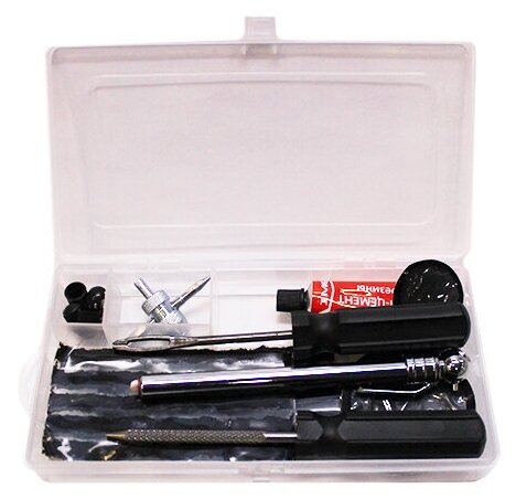 Полный набор средств для аварийного ремонта и обслуживания бескамерных шин: Содержание набора: шило с ушком для инсталляции резиновых жгутов (1 шт.) рашпиль (1шт.), тёрка металлическая (1 шт.) самовулканизирующиеся жгуты черного цвета (10 шт.) клей-цемент для резины (11 мл. – 1шт.) заплаты резиновые Ø 3,2 см – 3 шт, Ø 5,7 см. – 3 шт. манометр (1шт.) золотники (4 шт.) колпачки на вентиль пластиковые черные (4 шт.) инструмент для монтажа золотников (1 шт.) бокс для хранения (1 шт.)