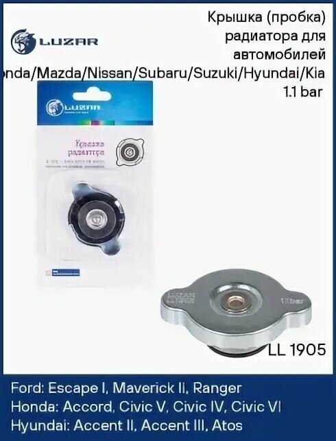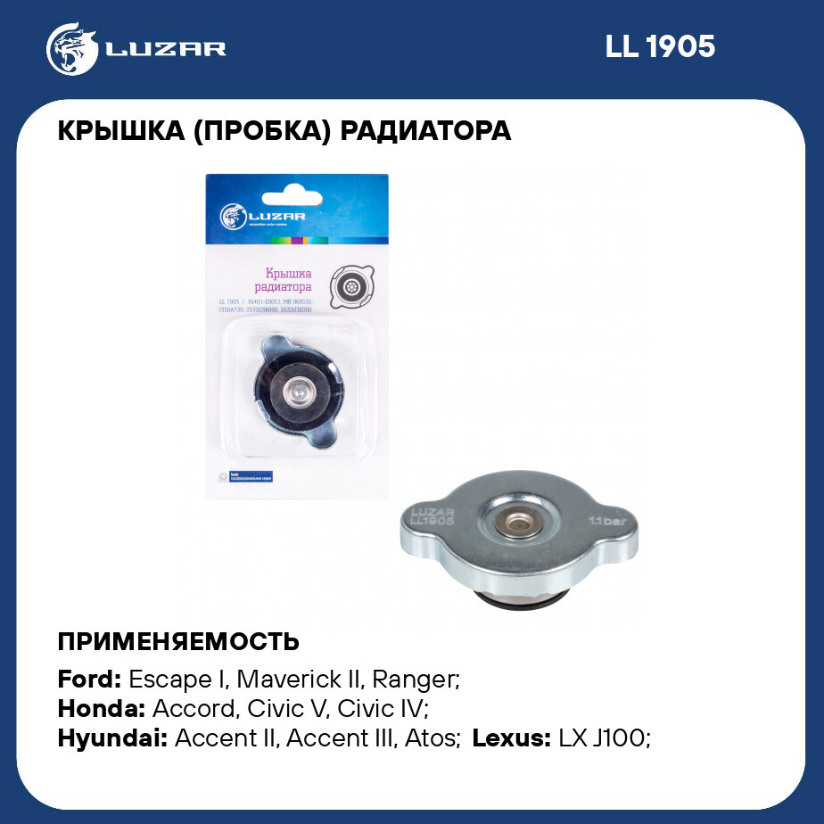 Крышка (пробка) радиатора для автомобилей Toyota/Mitsubishi/Honda/Mazda/Nissan/Subaru/Suzuki/Hyundai/Kia 1.1 bar (большой клапан) LUZAR (LL 1905)