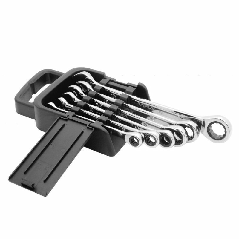| Прочие особенности и свойства | Ключ комбинированный с храповым механизмом используется для эффективного откручивания и закручивания резьбовых соединений. Рожковая часть обеспечивает доступ к головке болта сбоку, в то время как накидная часть отлично подходит для работы в ограниченном пространстве, что делает ключ незаменимым как в домашнем, так и в профессиональном использовании. Набор комбинированных гаечных ключей с храповым механизмом состоит из самых необходимых размеров:8мм, 9мм, 10мм, 12мм, 13мм, 17мм. Все элементы изготовлены из высококачественной стали. В кольцевой профиль ключей установлен специальный реверсивный храповый механизм (трещотка) с 72 зубцами, который обеспечивает легкий ход инструмента, а также быстрый и удобный монтаж резьбовых соединений - он исключает необходимость перехватывания кисти руки. |