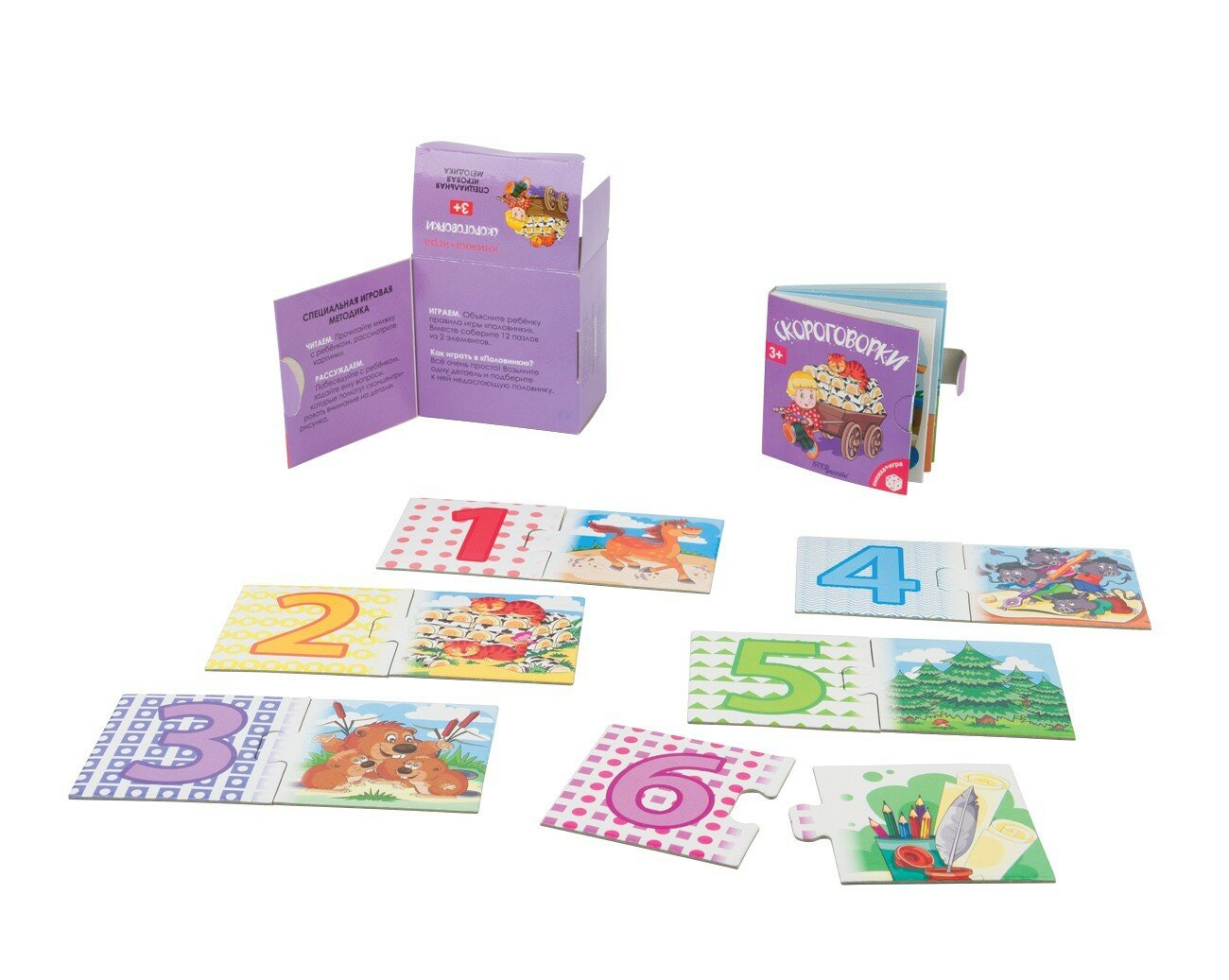 Комплектность: книжка "Скороговорки"; 12 пазлов, состоящих из двух элементов.