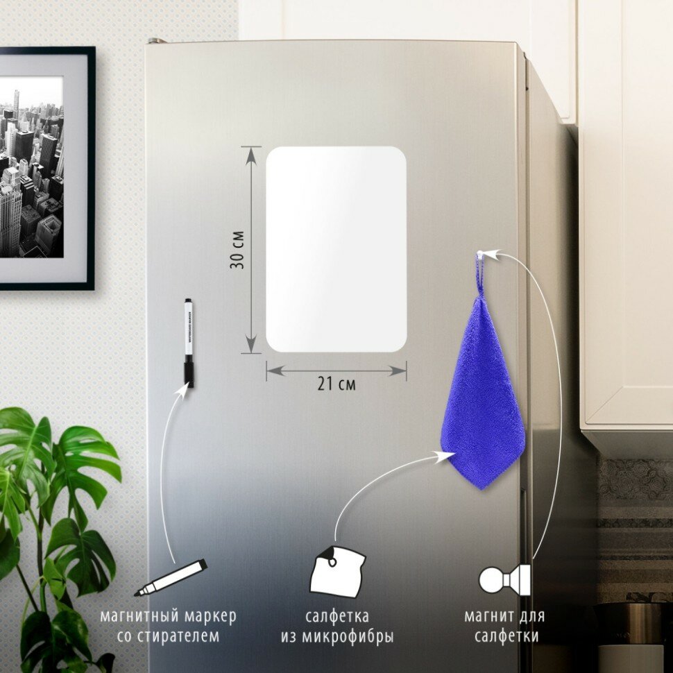 Размер доски 30х21 см (формат А4), так что вы легко найдете для нее место на своем холодильнике среди своих любимых памятных магнитов.