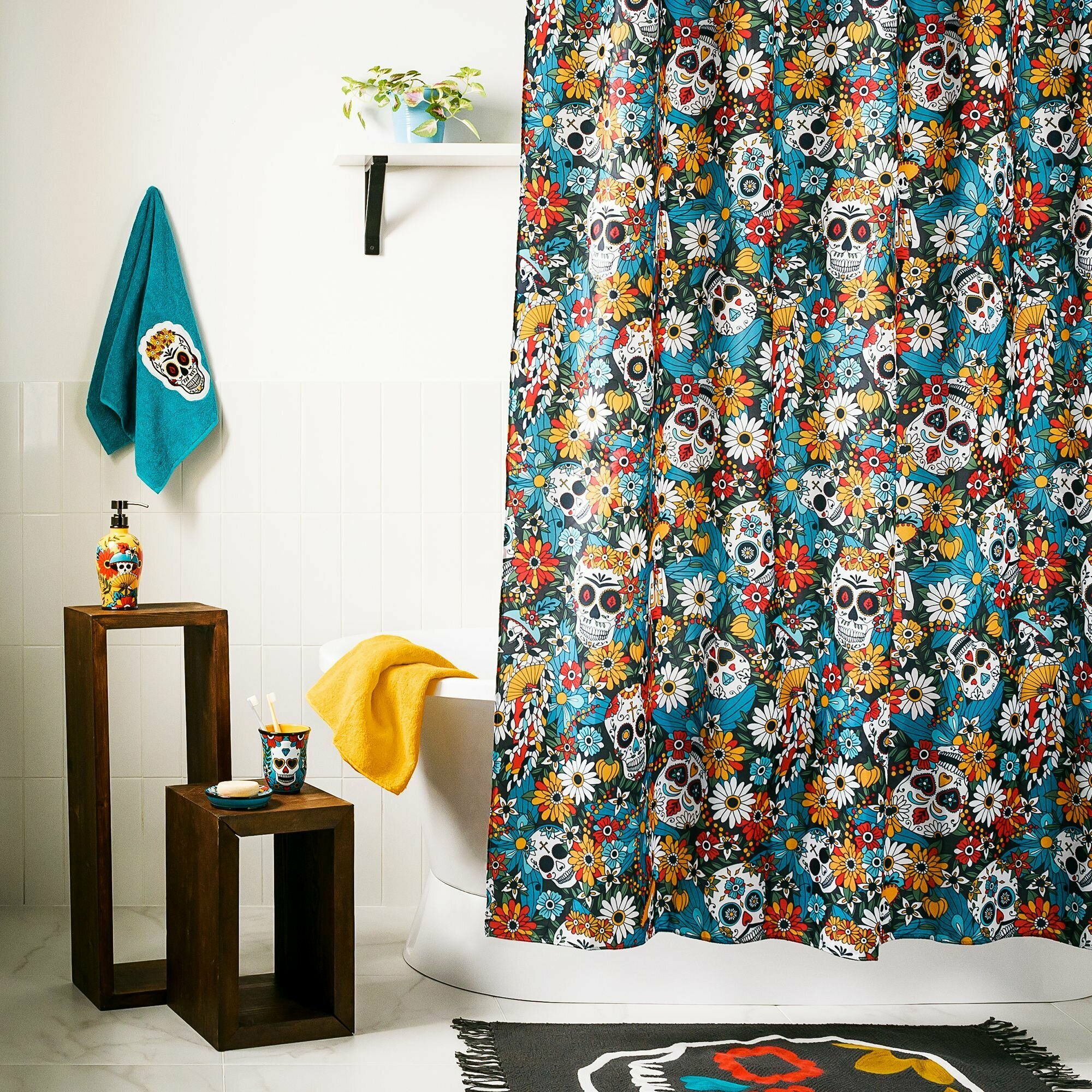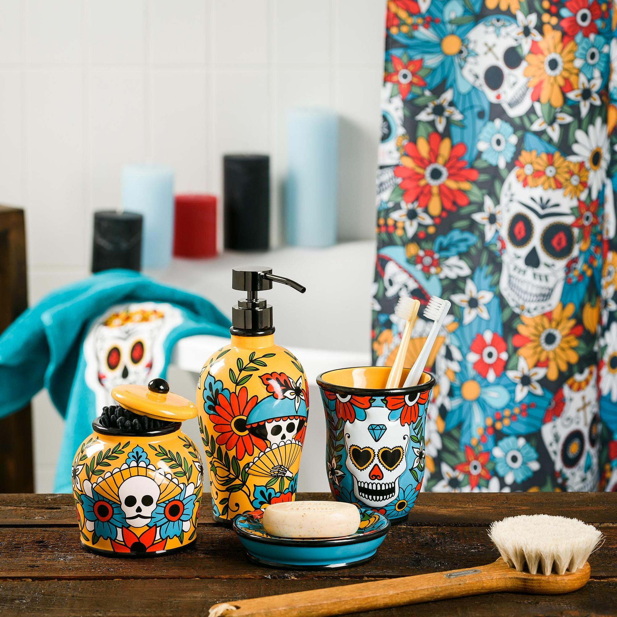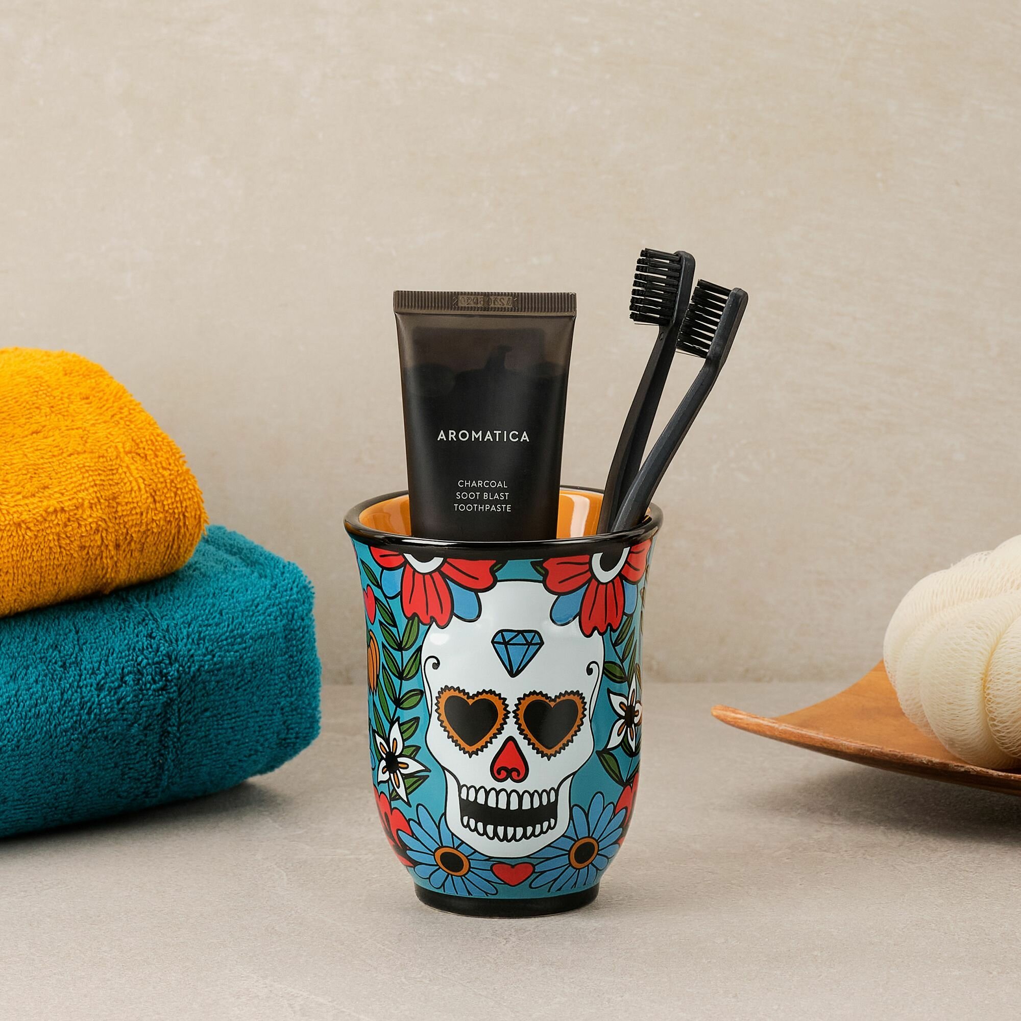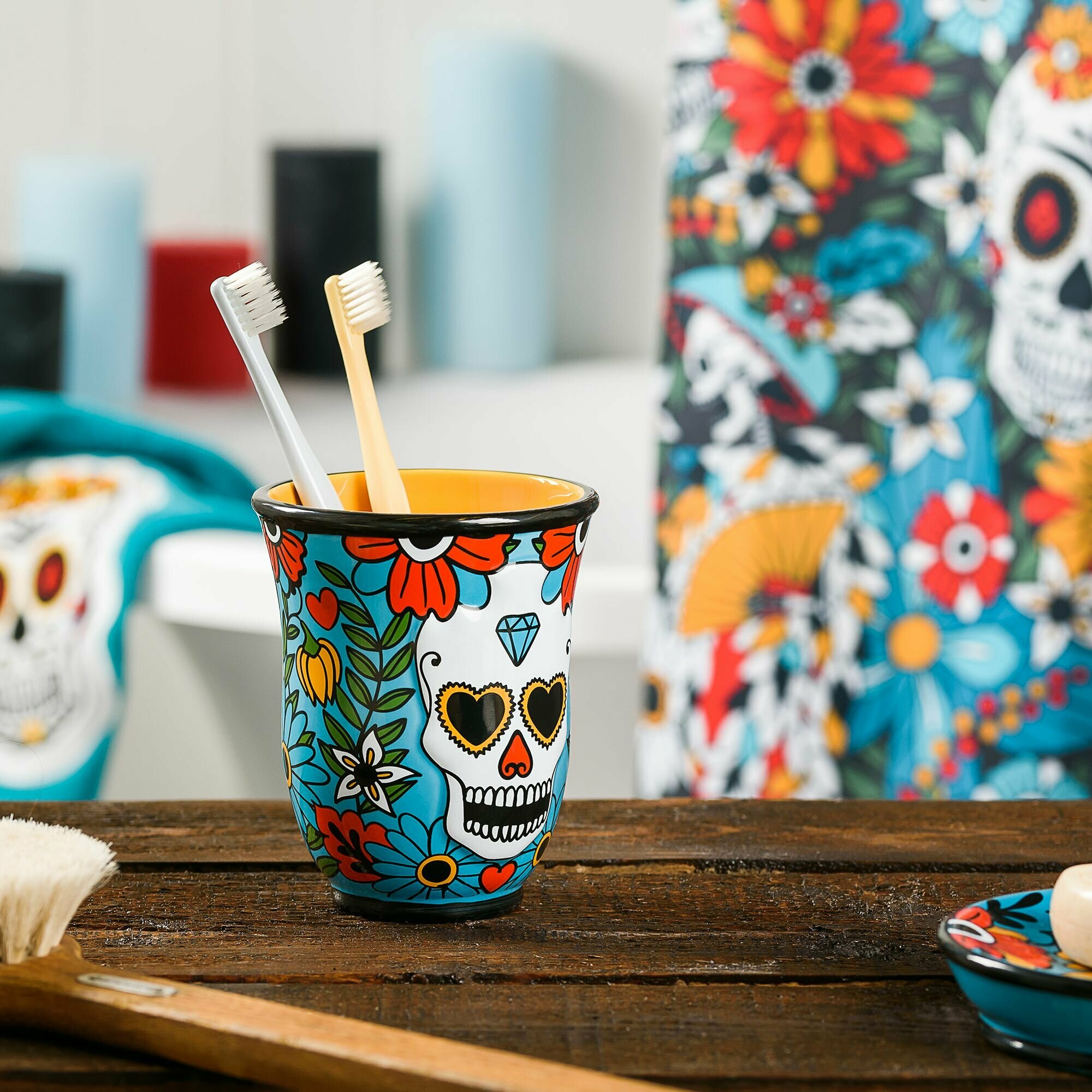 Керамический стакан для зубных щеток. Устойчивая модель с широким верхом позволяет хранить в стакане несколько зубных щеток. Стакан стилизован под известный мексиканский праздник День Мертвых. Стакан для щеток в комплекте с другими настольными аксессуарами прекрасно дополняет остальные элементы коллекции Los Muertos - занавеска для душа, полотенца и коврики в ванную.